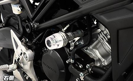 レースシーンからのフィードバックした製品で、転倒等してしまった際に車体へのダメージを最小限に抑えてくれる保護パーツです。プロテクターはレーシングスーツのバンクセンサーで使用されている特殊素材の強化クリアスライダーが装備されており、転倒時には滑って削れる事によって衝撃を吸収します。左右のスライダー間にロッドバーを挟み込んで支持する構造で、剛性を高めた仕様になっています。装着した状態でオイルキャップの取り外しも可能にしています。各部詳細はブラケットが3mm厚のSUS304ステンレス製、ロッドバーがSUS304ステンレス製、マウント部がシルバーアルマイト仕上げのアルミ製削り出し、強化クリアスライダーサイズが先端32mm、根元40mm、全高30mmです。ステンレスとアルミを組み合わせたしっかりとした作りになっています。無加工ボルトオンで装着できます。