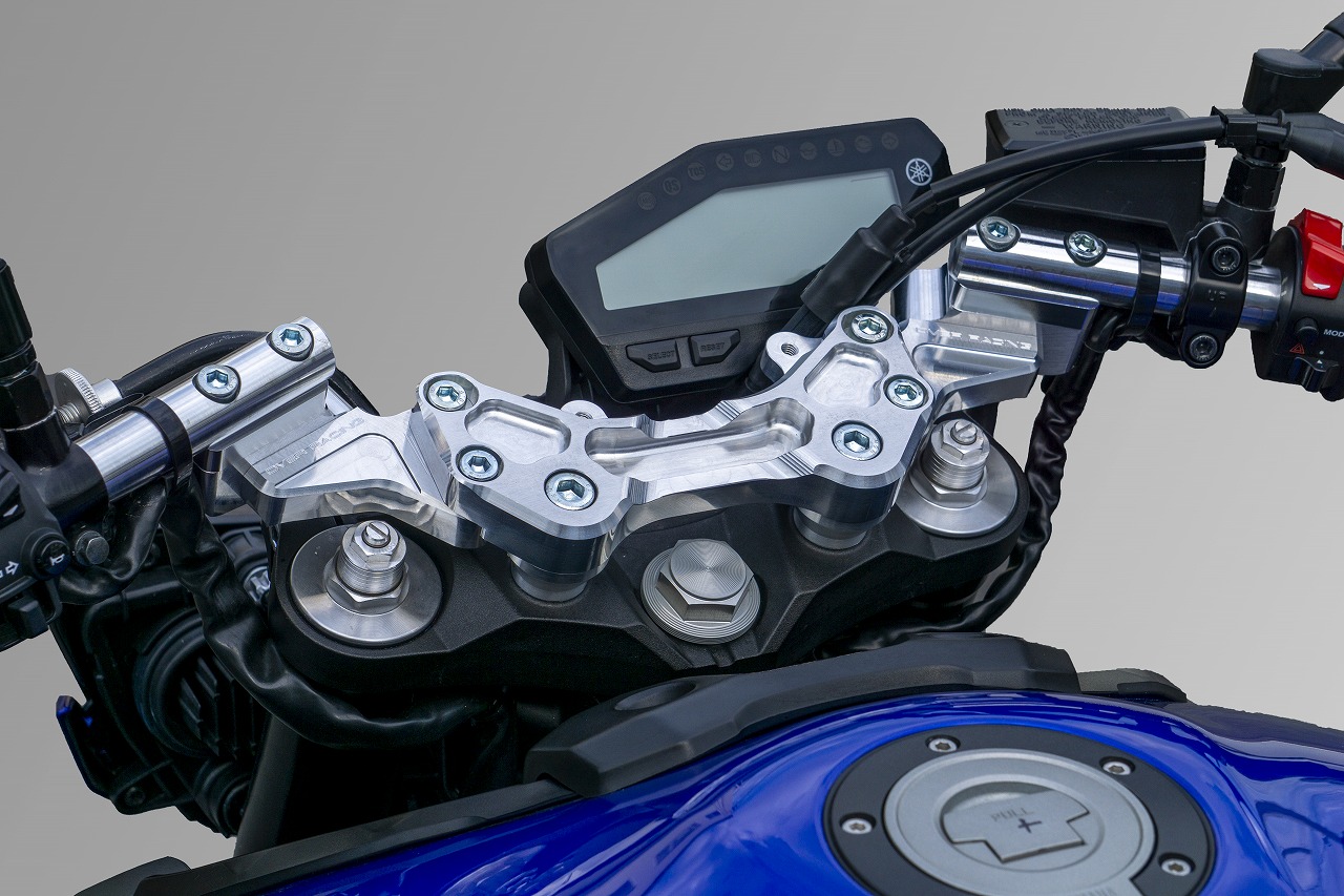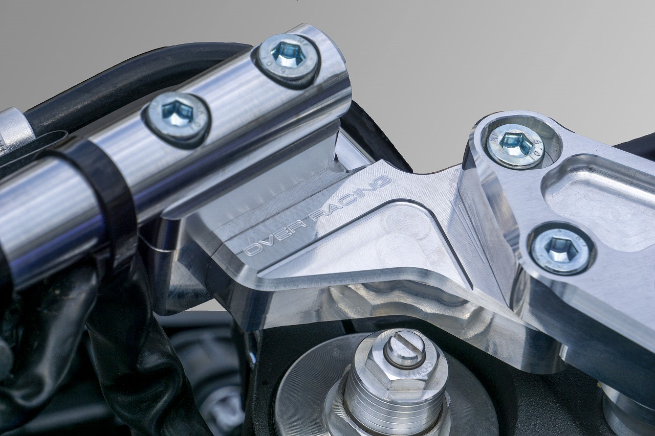 MT-09のキャッチコピーでもある「もっと自由に、もっと自在に」というのをコンセプトに開発。剛性の向上によりフロントの操作感がダイレクトかつクイックになり、より自在にMTを操る楽しさを感じる事が出来ます。ほど良い前傾姿勢を取ることで、ワインディングなどで積極的なライディングをより楽しむことが出来ます。またOVER特有のアルミ削り出しパーツは、こだわり抜いた構造により機能美を創出します。純正のトップブリッジを使用する事で簡単に交換することが可能に。ポジションも各部に調節機構を設けており、最適なポジショニングを選択することが出来ます。ハンドルバー、クランプ、スペーサーのキットです。ハンドルバークランプ 5mmのみ装着時(純正比)・ハンドルバー垂角0°:約-65mm・ハンドルバー垂角5°:約-80mm・ハンドルバー垂角10°:約-95mmハンドルバークランプ 5mm+10mmUPスペーサー装着時(純正比)・ハンドルバー垂角0°:約-55mm・ハンドルバー垂角5°:約-70mm・ハンドルバー垂角10°:約-85mm・高さ調整:0mm/10mm(スペーサー使用時)・ハンドルバー垂れ角調整:0/5/10度・絞り幅:780.0〜790.0mm・シルバーアルマイト仕上げ・STDケーブル、ホース、スイッチハウジング対応・ハンドルロック使用可能・バーエンドキャップ(樹脂/白)付属・取付けボルト類付属