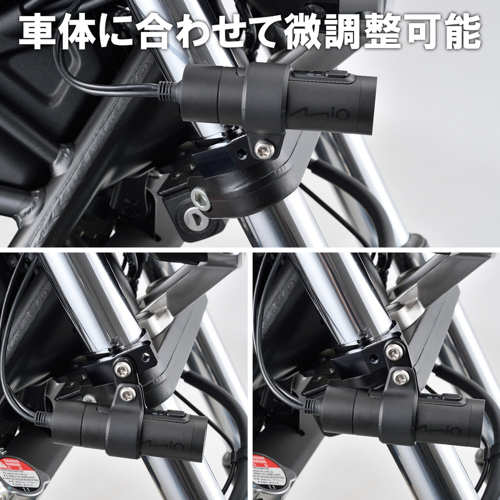 フォーク径φ41〜φ47に対応。カメラの角度を細かく調節可能です。M777D用フロントカメラステーフォーク(φ41〜47)用アルミ製黒アルマイト仕上げカメラ角度を細かく調節可能