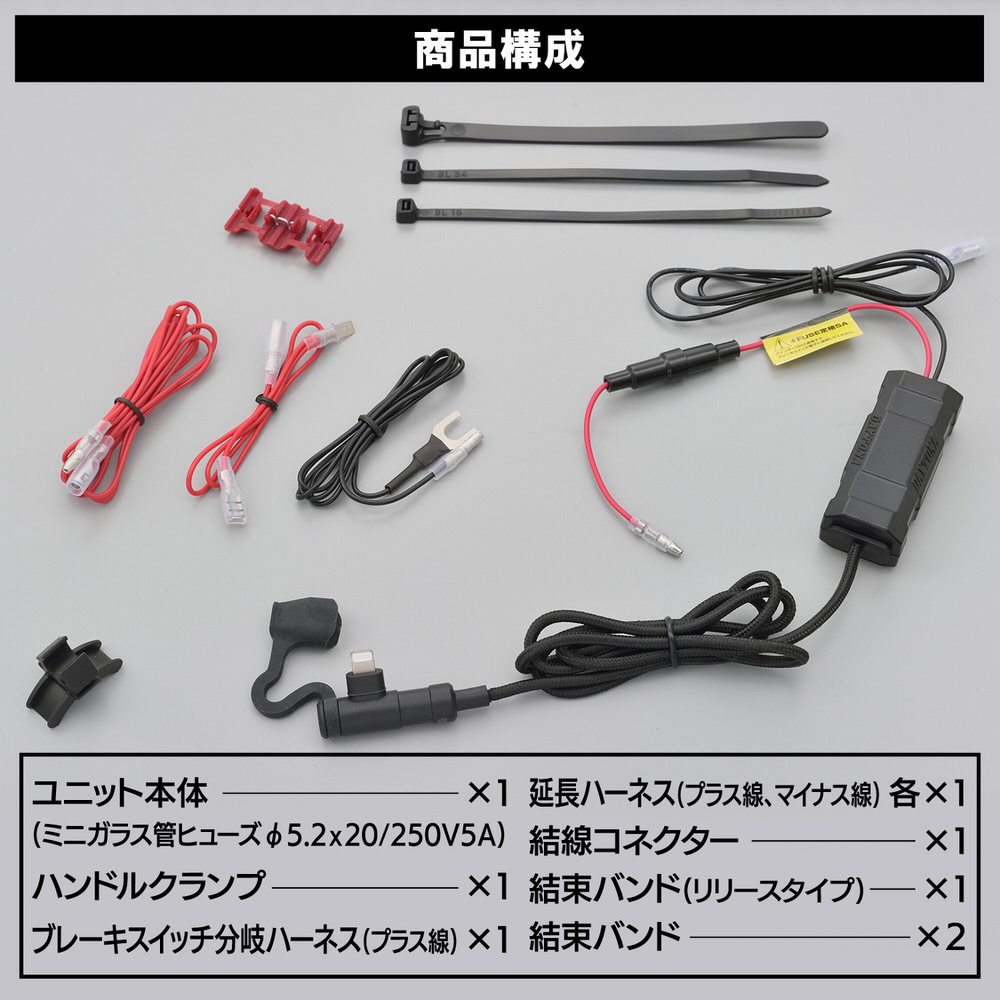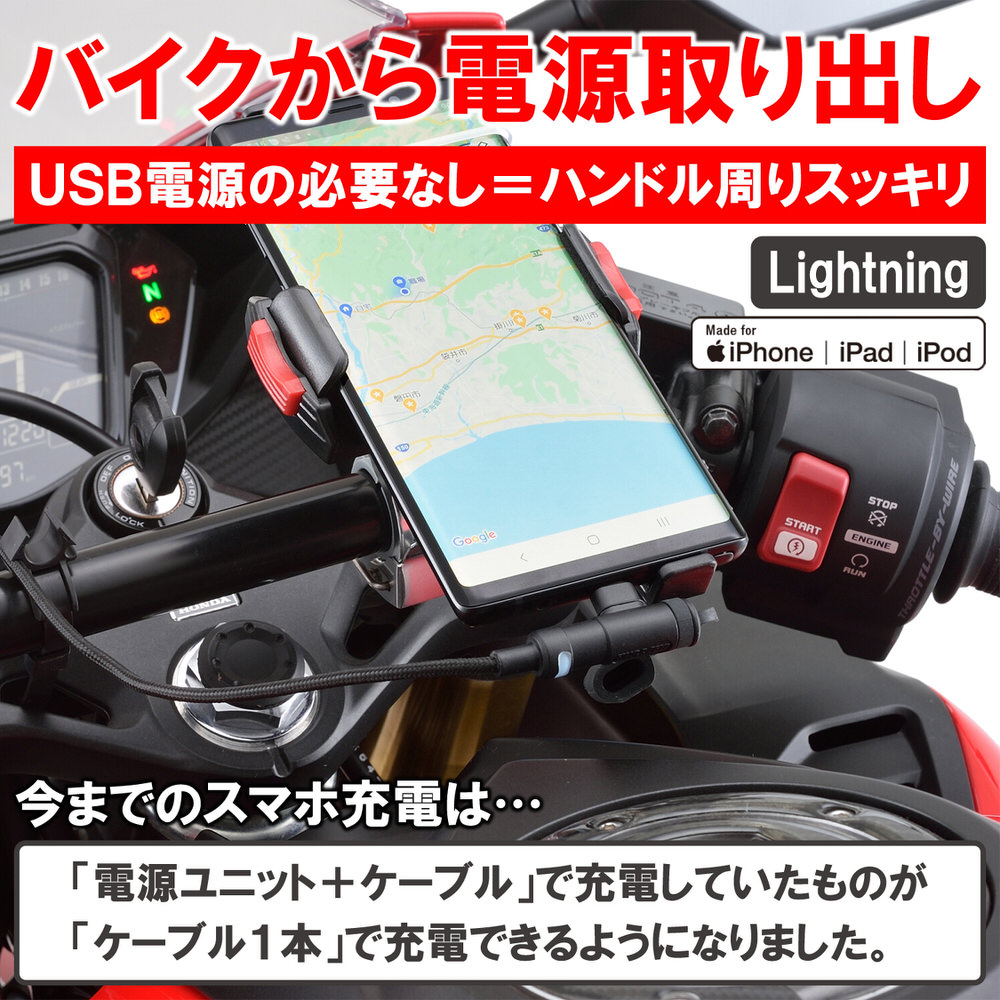 【L字コネクター】張り出しの少ないコンパクトなL字コネクターを採用することで、ハンドルを切った時のケーブルの突っ張りや断線を抑止します。【ケーブル1本で充電可能】今までのスマホ充電は「電源ユニット+ケーブル」でしたが、「ケーブル1本」で充電が可能となりました。バイクのハンドル周りがスッキリします。【雨でも安心の防水設計】端子部分を大きく覆うキャップがついているので、使っていないときも端子を濡らさないから安心。【急速充電が可能】LightningコネクターでiPhone・iPad・iPodの急速充電に対応。MFi認証を取得しているので安心です。最大18W(5V/3A、9V/2A、12V/1.5A)出力可能。【電源の取り出しはブレーキスイッチに割り込ませるだけ】ブレーキスイッチに割り込ませることで簡単に電源の取り出しが可能です。※ブレーキスイッチに平型端子(187型)を採用していない場合は、付属の延長ハーネス(CA103型)で接続してください。LightningL字コネクターがケーブルの突っ張り、断線を抑止別途電源の必要なし。このケーブル1本でスマホ充電可能ブレーキスイッチに割り込ませるだけで電源取り出し急速充電に対応※ブレーキスイッチに平型端子(187型)を採用していない場合は、付属の延長ハーネス(CA103型)で接続してください。