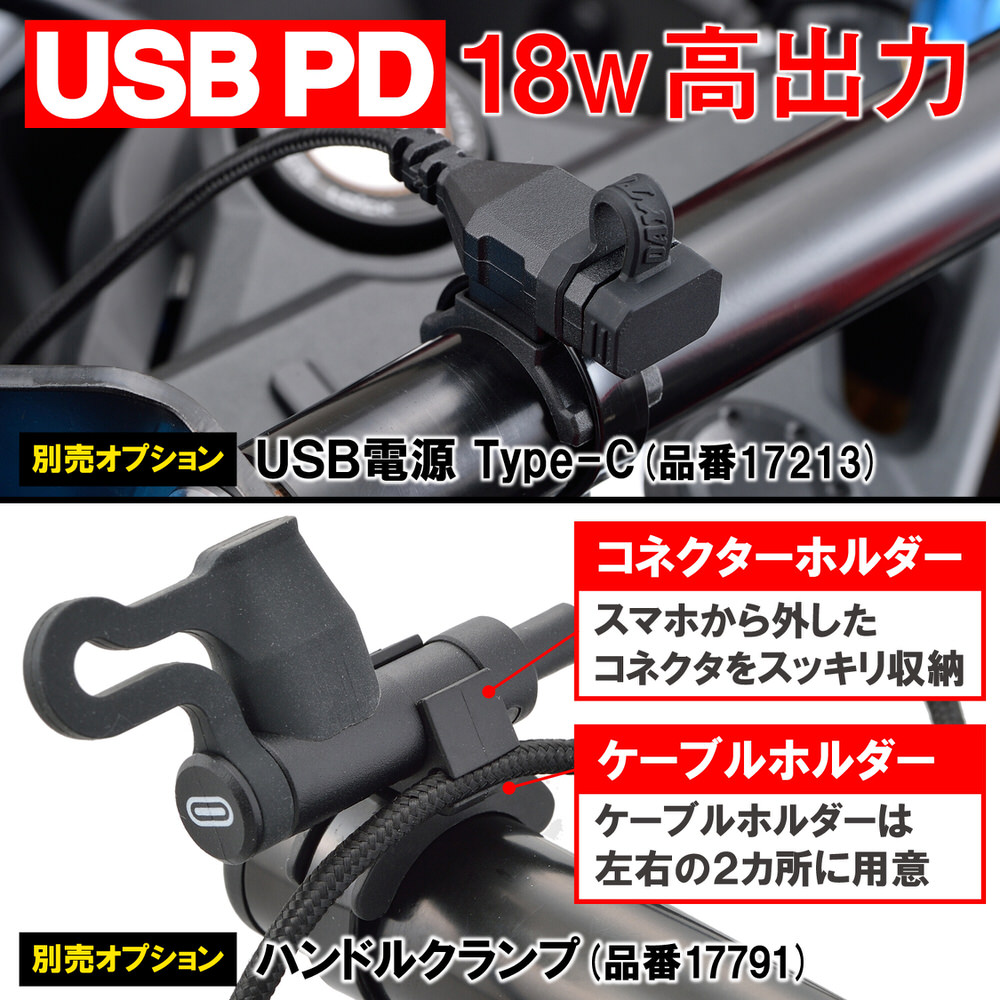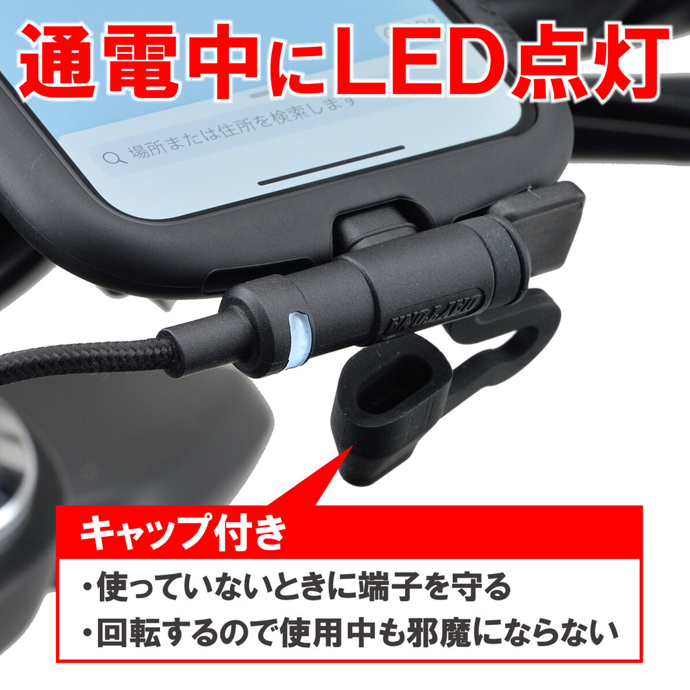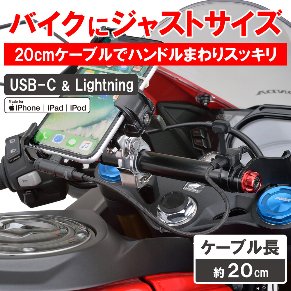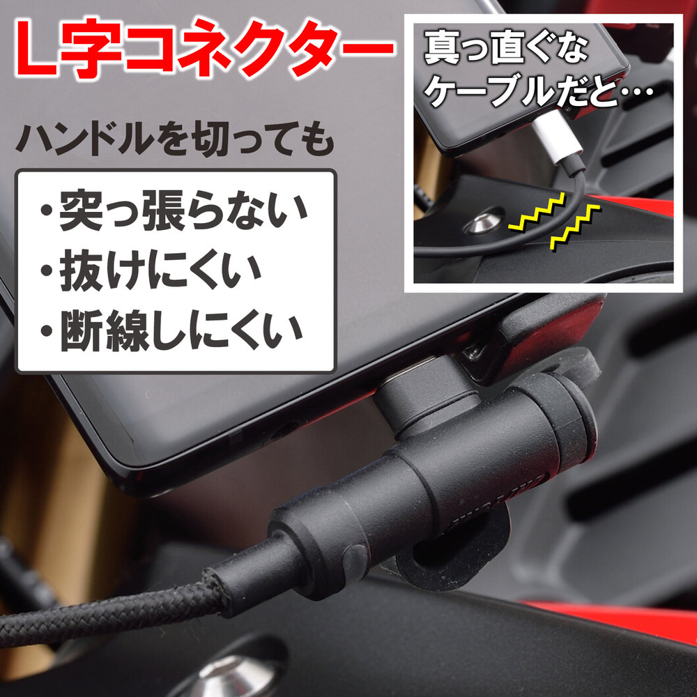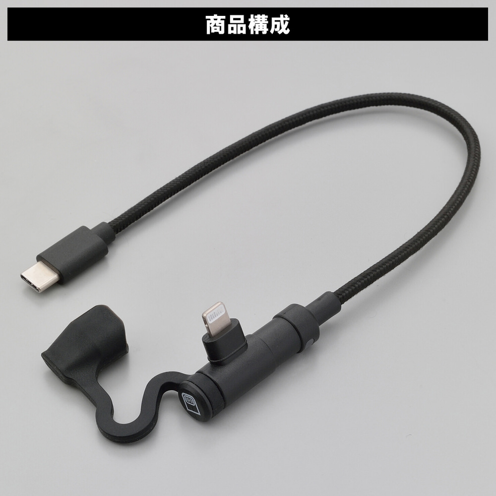 【L字コネクター】張り出しの少ないコンパクトなL字コネクターを採用することで、ハンドルを切った時のケーブルの突っ張りや断線を抑止します。【バイクのハンドルにジャストサイズ】バイクにぴったりな20cmのコードはハンドルまわりで邪魔になりません。【急速充電対応】最大電流容量は18W。高出力のデイトナUSB電源や、急速充電器の性能を十分に発揮できます。USB-C & LightningMFi認証L字コネクターがケーブルの突っ張り、断線を抑止20cmケーブルがハンドルにジャストサイズ急速充電に対応(電源が急速充電に対応している必要があります)※データ転送に使用する場合、コネクター内に異物や汚れがないか確認をしてください。データの損傷、破損に対して保証は致しかねます。※LEDは機器に接続すると点灯します。※防水機能はありません。※本商品は日本での使用を前提としております。