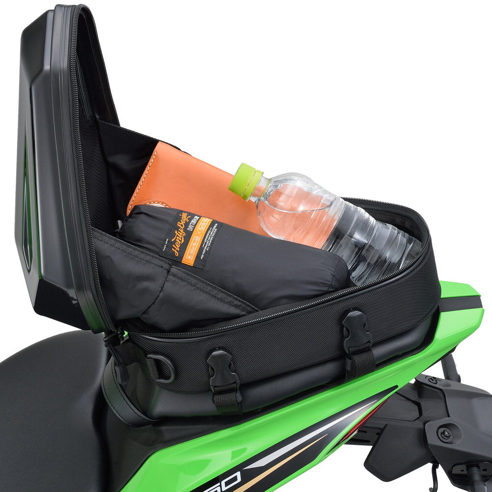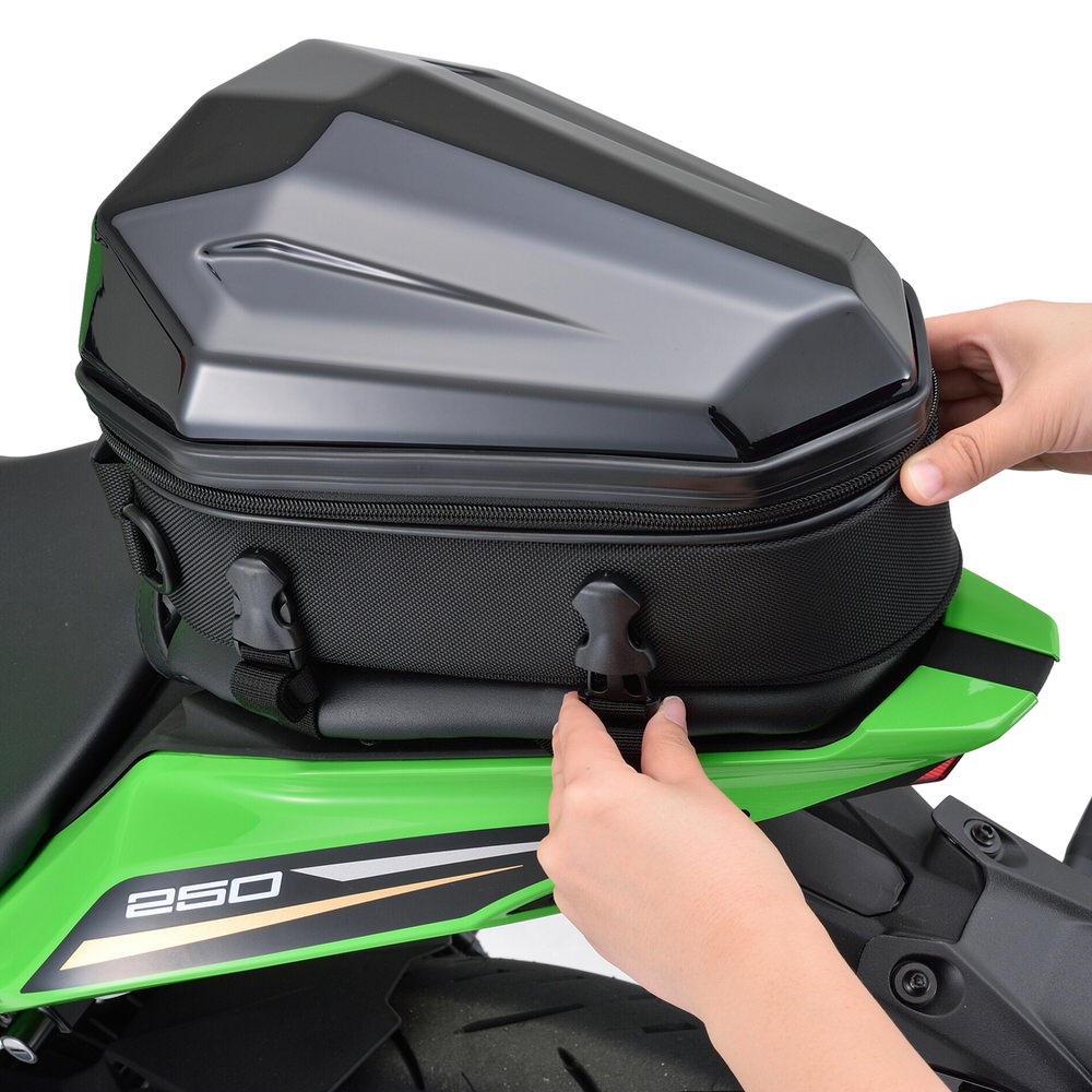 カウルとの一体感を追求したワンランク上のシェルシートバッグ。スポーティなデザインが、スーパースポーツやストリートファイターモデルにフィット。トップシェルには強度が高く割れにくいポリカーボネートを採用。EASY RING BELT(イージーリングベルト)付属。トップシェル:ポリカーボネート(PC)容量:5.5Lサイズ:H165×W220×D295(mm)最大積載重量:5.5kg付属品:イージーリングベルト(N20A)/レインカバー