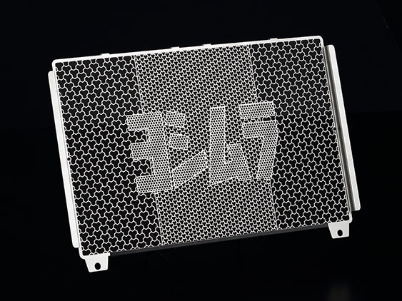 エッチング加工による高精度のhexagonal(ヘキサゴナル=亀甲)メッシュパターンを採用。ヨシムラ独自の「Yライン」を描く美しい網目の中央にはシンプルで主張しすぎない デザインの「ヨシムラ」ロゴを配置。ドレスアップ要素と実用性を備えています。