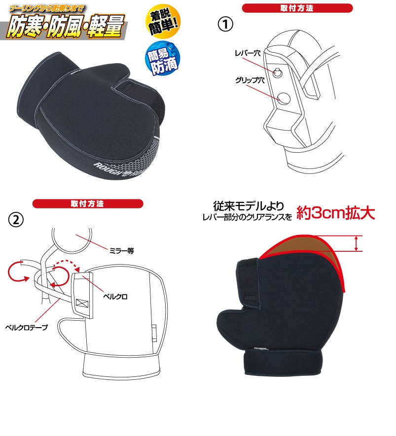 取付簡単な防寒・防風・軽量ハンドルカバー。取付時前面からの風圧によるハンドルカバーとレバーの干渉を防ぐ形状に改善。取付はグリップエンドから差し込み脱落防止面ファスナーテープで車体に固定するだけの簡単取り付け。車種汎用性も高く様々な車種に取付可能です。特に原付、原付二種との相性は抜群でおすすめです。ハンドルカバーの入り口にはジャージ素材のストームガード、グリップ、レバー差込口は密閉性の高いクロロプレンですきま風をシャットアウトし非常に高い保温性を確保しました。【素材】PVC、クロロプレン、ウレタン