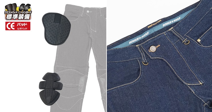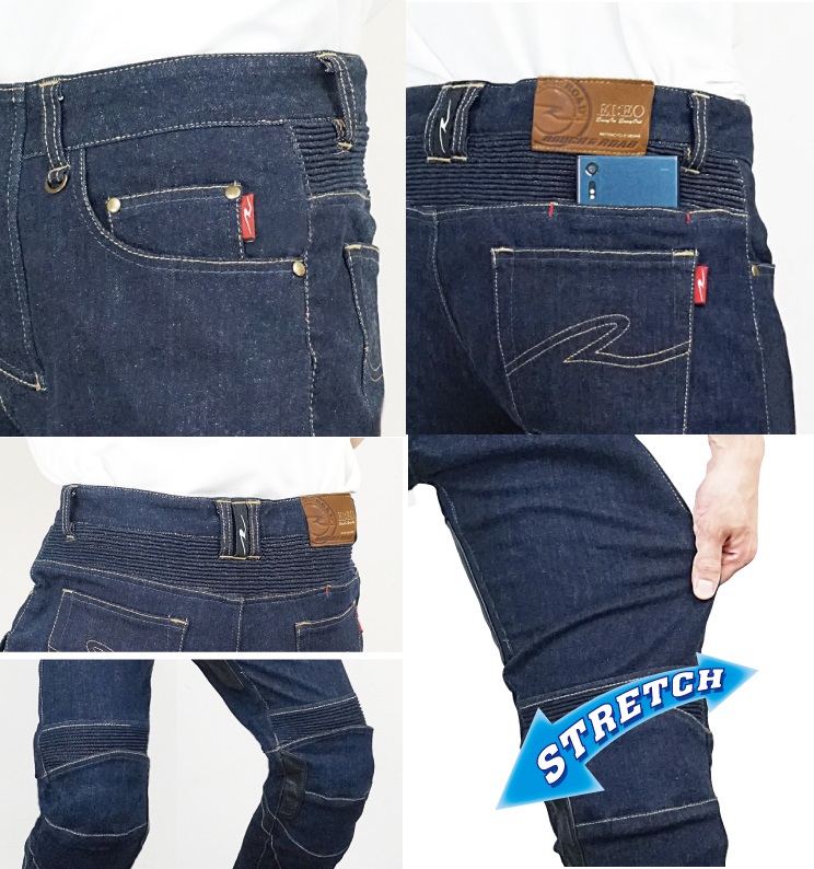 特徴的な外入れ仕様のニーガードで膝パッド脱着が自由自在。ライディング時にはニーパッドを瞬時にEasy In、バイクを降りたあとはニーパッドをEasy Out、瞬時にモードチェンジが可能。取外し式ウエストパッドも標準装備し高い安全性を誇ります。ストレッチデニム素材と膝・腰のシャーリングパーツの組み合わせで最高の運動性能を発揮し長時間の着用でも疲れ知らず。防風・透湿ウインドガードで寒風をシャットアウトしつつ、内側には裏起毛加工を施した高い保温効果で寒い時期にも対応しました。攻めのライディング(Easy In)、リラックス(Easy Out)の切り替えが自由自在なバイカージーンズです。COLOR ワンウォッシュネイビーシルエット: スリムストレートMATERIAL: 裏起毛ウインドガードストレッチデニム、牛革(モモ、ヒザ当て部)PROTECTOR: ウエストバッド、ニーガード標準装備(ニーガードはCE規格)