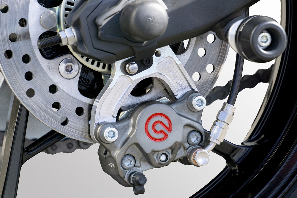 最大の特徴であるキャリパーを上下自由にマウント可能なのはもちろんの事、ABSに対応した機能美とアルミ削り出しアルマイト仕上げの造形美を両立したキャリパーサポートに。また確かな精度によってキャリパー本来の性能を引き出すことが可能に。カラーリングはシルバー。ブレンボ製2P(カニ)キャリパー(φ32/φ34)用取付けボルト付属シルバーアルマイト仕上げ・ABS対応・STDブレーキローター(φ220x5t)対応・純正スイングアーム対応・純正ホイール対応・上下で取付を選択可・純正ブレーキホース使用不可ブレンボキャリパーと専用バンジョーボルトは付属しません。