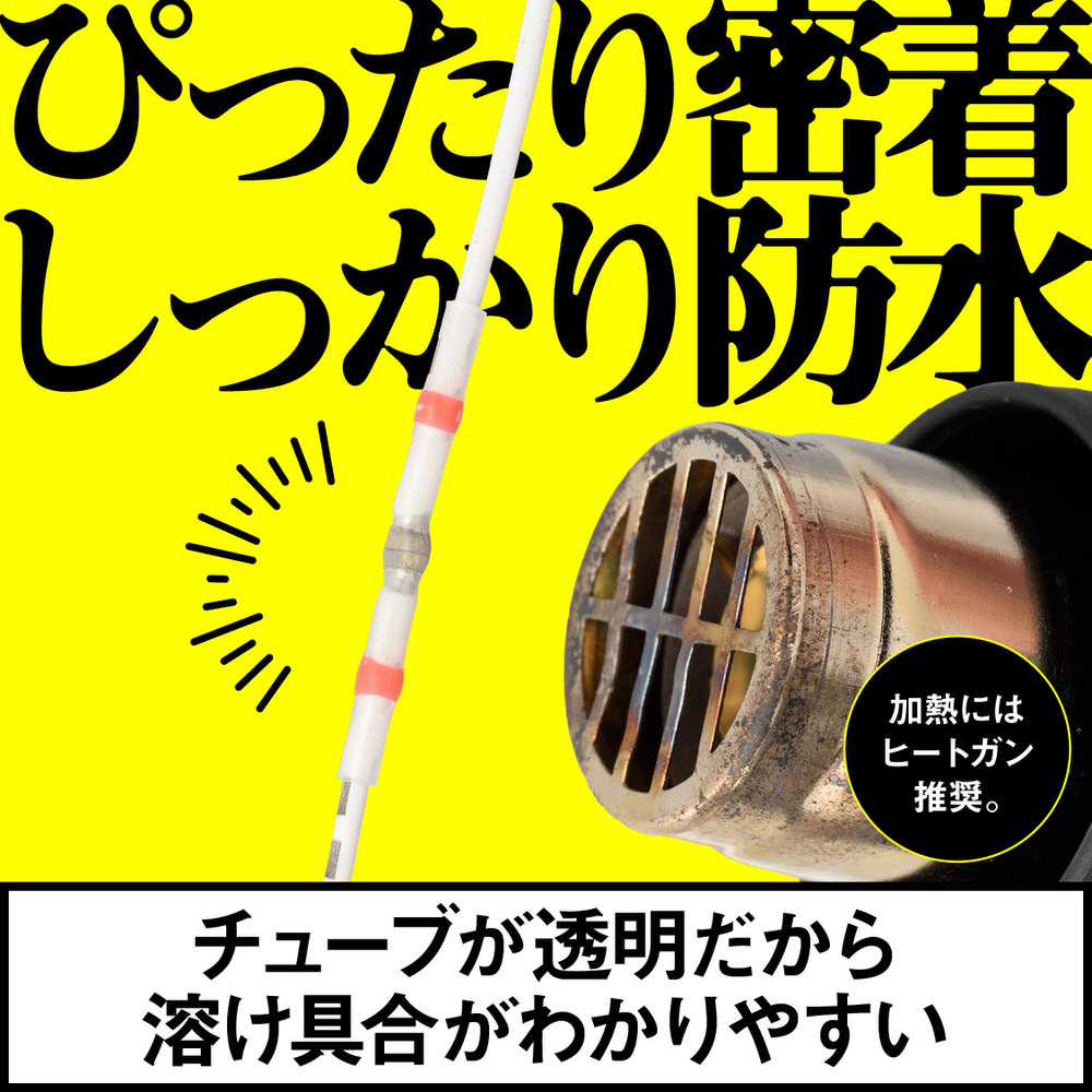 リング状のハンダが入った収縮チューブ。線の継目にダブルリングのハンダが溶け込み収縮することで結線。チューブ内の色付き溶着材が加熱時に配線に密着することで、施工後の防水&抜け防止に役立ちます。透明なチューブで確実&楽に作業ができます。φ2.7/40mm ×5個ダブルリングのハンダが溶け込み確実に結線両端の溶剤が密着して防水&抜け防止収縮開始温度:約80℃/収縮終了温度:約125℃/ハンダ溶解温度:約138℃収縮比率:約2:1※ご使用の際はハンダが溶けるまで加熱してください。ハンダを溶かさずチューブの収縮のみで結線すると、導通不良や抜ける等の原因となります。※溶着剤は完全防水ではありません。施工状況により、溶着材が配線の銅に密着しない場合があります。※ライターの火などで炙ると焦げたり、均一に収縮されない場合があります。※加熱にはヒートガンを推奨しています。