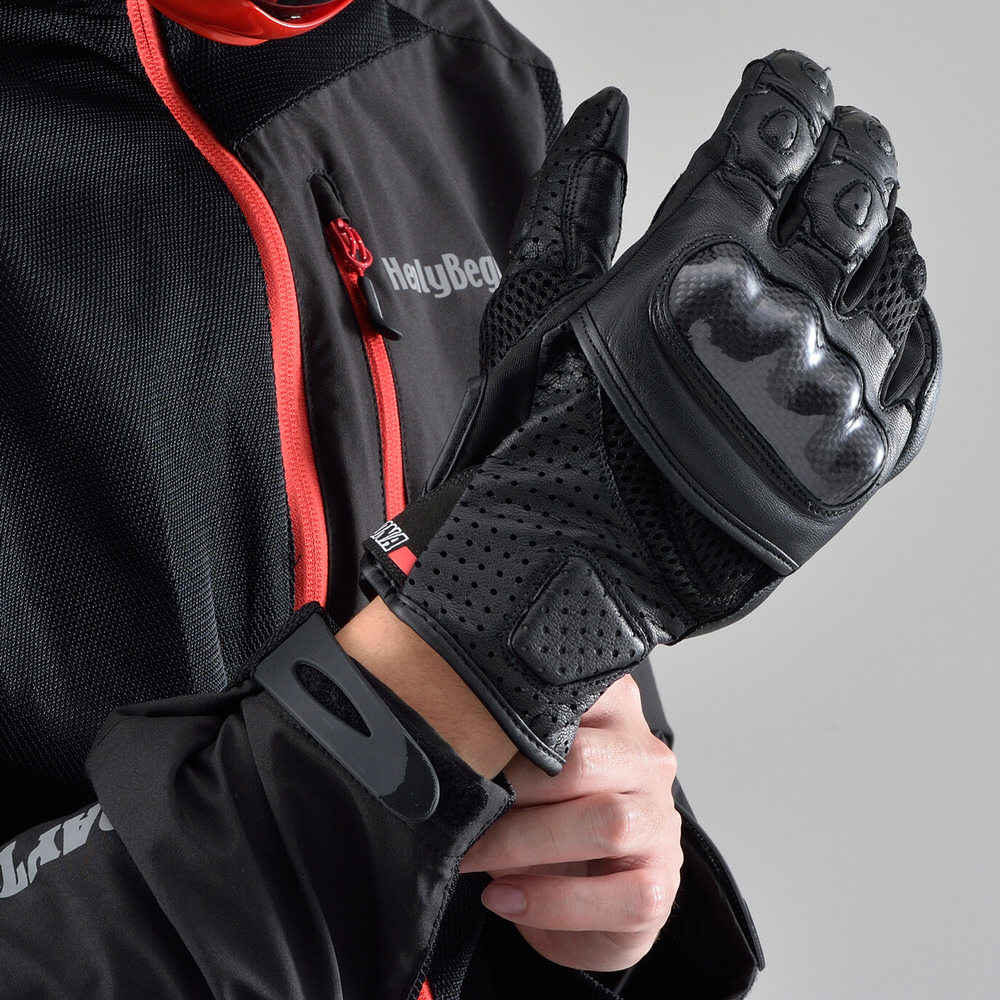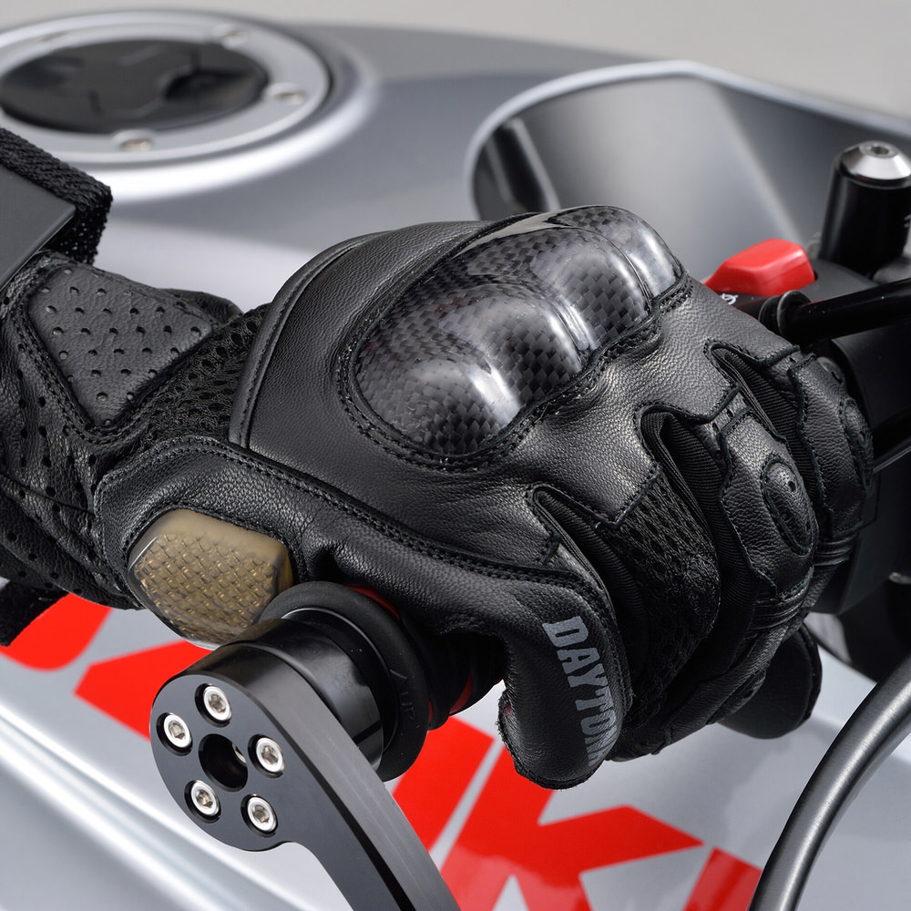 本革の安全性×高通気性。スポーツタイプの夏用フラッグシップモデル。パンチングゴートレザーとメッシュ生地を使用し高い通気性と安全性を確保。転倒時、手の平の衝撃を滑らせて逃がすパームスライダー装備。タッチパネル対応。素材:本革(やぎ革)プロテクター:カーボンパームスライダー:TPU
