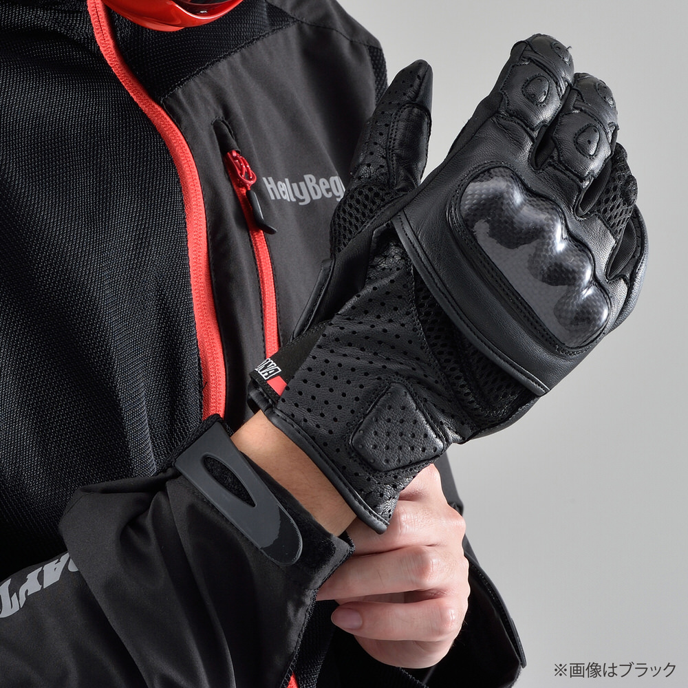 本革の安全性×高通気性。スポーツタイプの夏用フラッグシップモデル。パンチングゴートレザーとメッシュ生地を使用し高い通気性と安全性を確保。転倒時、手の平の衝撃を滑らせて逃がすパームスライダー装備。タッチパネル対応。素材:本革(やぎ革)プロテクター:カーボンパームスライダー:TPU