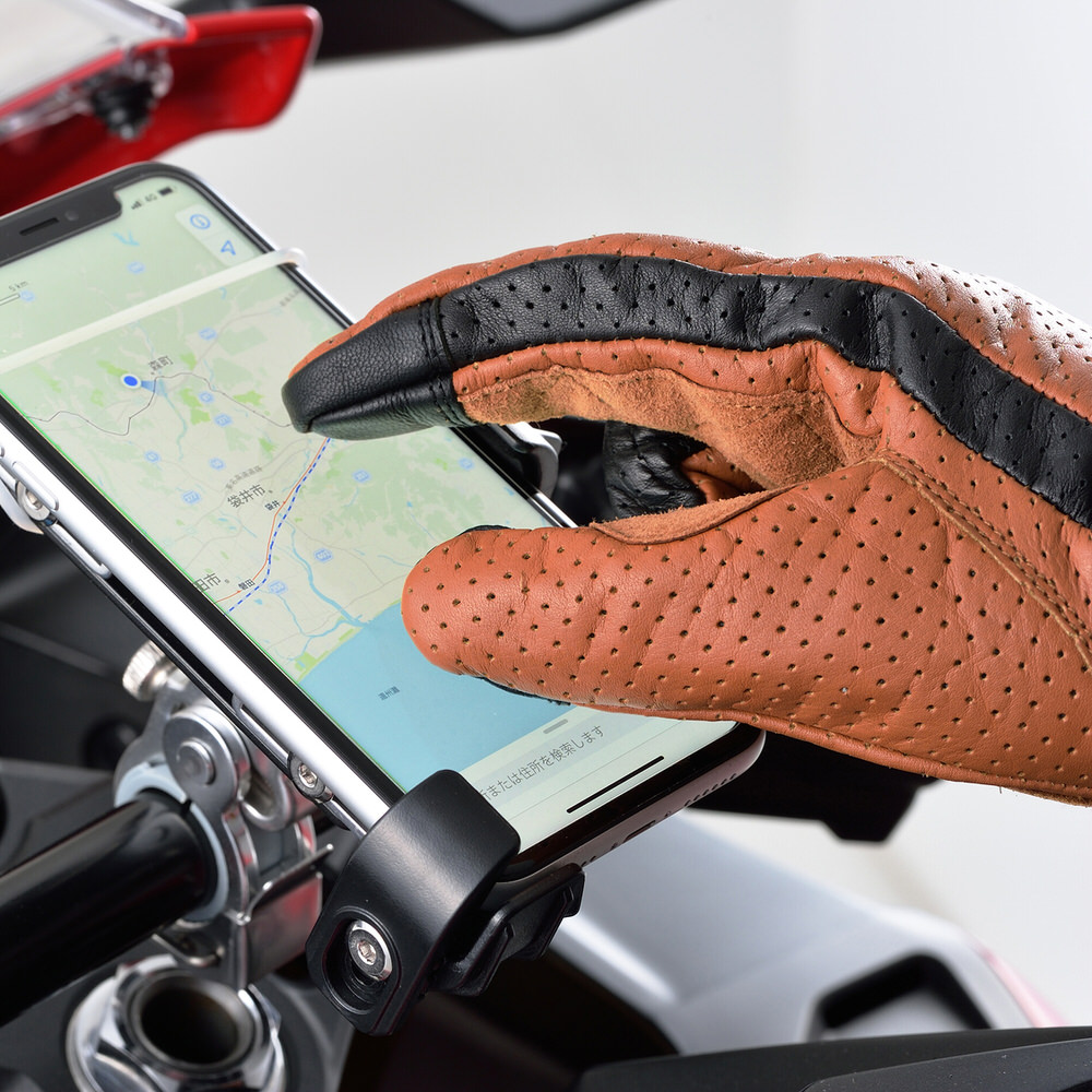 しっとり柔らかな牛革をフィット感の良い立体裁断で仕立てたライディンググローブ。パンチング部は裏地もメッシュ生地にすることで、通気性を確保しました。人差し指のタッチパネル対応部は側面まで回り込んでいるので、ストレスなくスマートフォンを操作できます。サイズ:Sサイズカラー:ブラウン素材:牛革 / メッシュ生地パンチング / 春夏秋タッチパネル対応