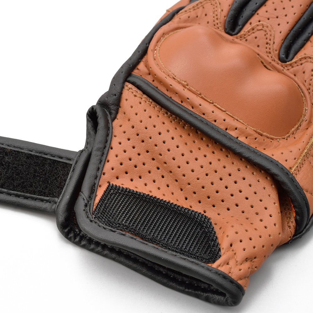 しっとり柔らかな牛革をフィット感の良い立体裁断で仕立てたライディンググローブ。パンチング部は裏地もメッシュ生地にすることで、通気性を確保しました。ハードナックルプロテクターは手を握ったときにも突っ張りが少ないフローティング構造を採用しています。人差し指のタッチパネル対応部は側面まで回り込んでいるので、ストレスなくスマートフォンを操作できます。サイズ:Mサイズカラー:ブラウン素材:牛革 / メッシュ生地 / プロテクター:PVCパンチング / 春夏秋タッチパネル対応