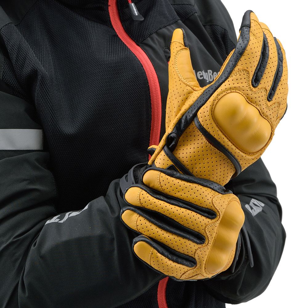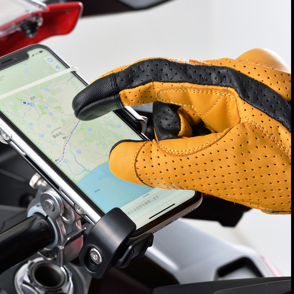 しっとり柔らかな牛革をフィット感の良い立体裁断で仕立てたライディンググローブ。パンチング部は裏地もメッシュ生地にすることで、通気性を確保しました。ハードナックルプロテクターは手を握ったときにも突っ張りが少ないフローティング構造を採用しています。人差し指のタッチパネル対応部は側面まで回り込んでいるので、ストレスなくスマートフォンを操作できます。サイズ:Mサイズカラー:イエロー素材:牛革 / メッシュ生地 / プロテクター:PVCパンチング / 春夏秋タッチパネル対応