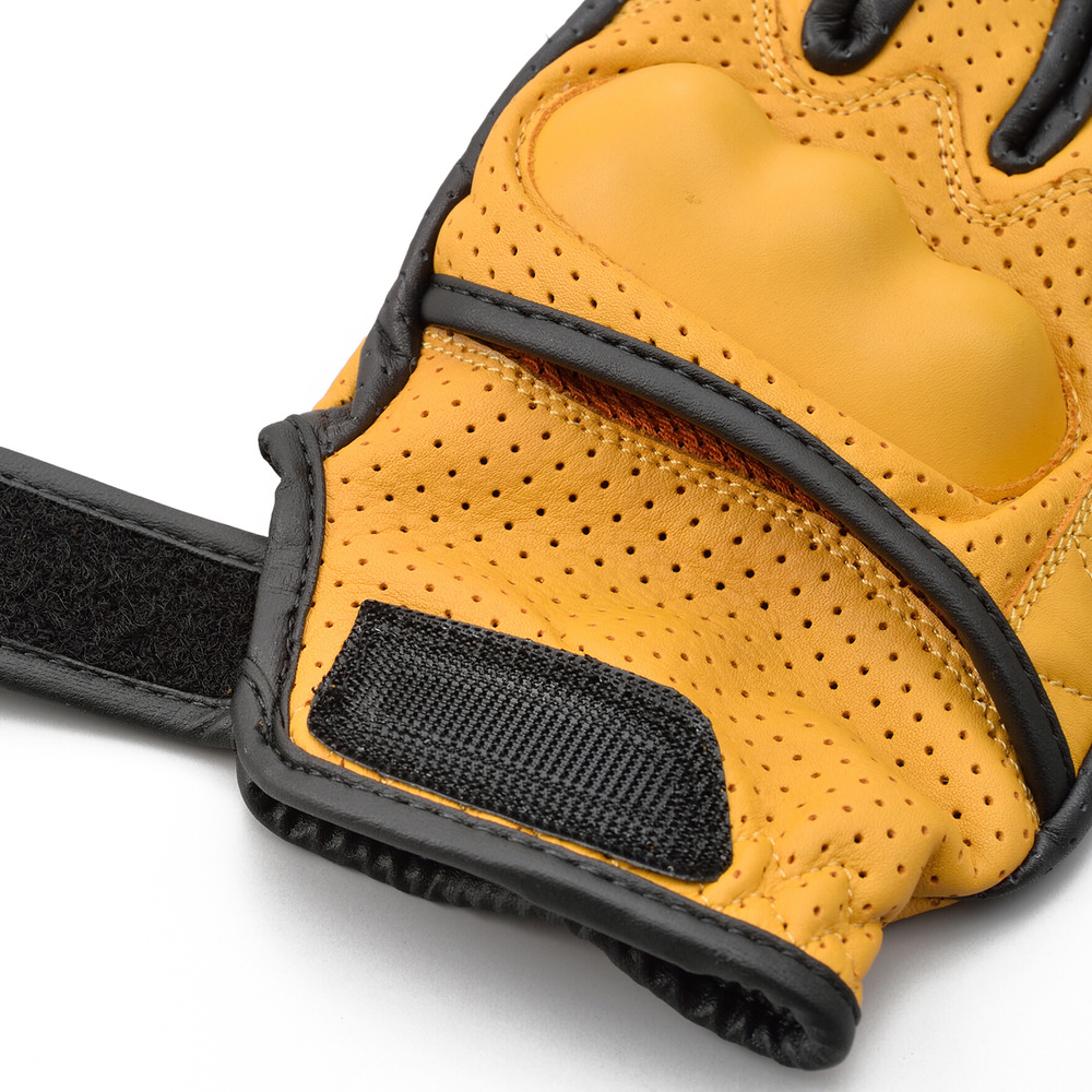 しっとり柔らかな牛革をフィット感の良い立体裁断で仕立てたライディンググローブ。パンチング部は裏地もメッシュ生地にすることで、通気性を確保しました。ハードナックルプロテクターは手を握ったときにも突っ張りが少ないフローティング構造を採用しています。人差し指のタッチパネル対応部は側面まで回り込んでいるので、ストレスなくスマートフォンを操作できます。サイズ:Lサイズカラー:イエロー素材:牛革 / メッシュ生地 / プロテクター:PVCパンチング / 春夏秋タッチパネル対応