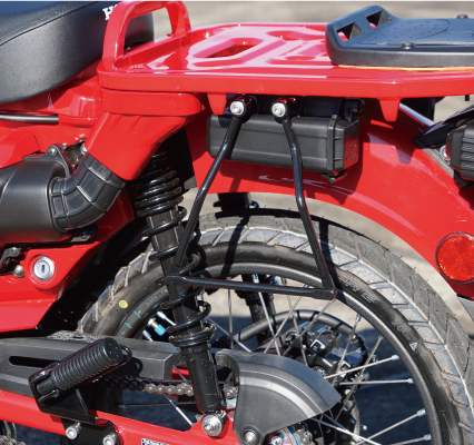【商品情報】サイドバッグの積載時の車体とのスレ防止、タイヤへの干渉はもとより危険な巻き込みを防ぐサイドバッグサポートに、CT125ハンターカブ専用キットをラインナップ。純正ツールボックス取付ボルト部に専用カラーを挟むことでボックスを躱すオフセット取り付けが可能となりサイドバッグサポートとツールボックスの供用が可能。平面部は荷台横幅と面一になりサイドバッグ取付時のバックビューもきれいなシルエットになります。サポートなしでバッグを下げるとリアショックやウインカー等と干渉し場合によってはタイヤへの巻き込みも考えられますのでサイドバッグサポート使用し安全安心なライディングを心掛けることをお勧めします。■注意事項段差、ギャップ通過による衝撃、経年使用によるサイドバッグサポートの内側への曲がりによる巻き込みが考えられますので 運転前点検で異常がないこと、また走行中に段差等で衝撃があったときは直ちに運転を中止し不具合があれば使用を中止してください。