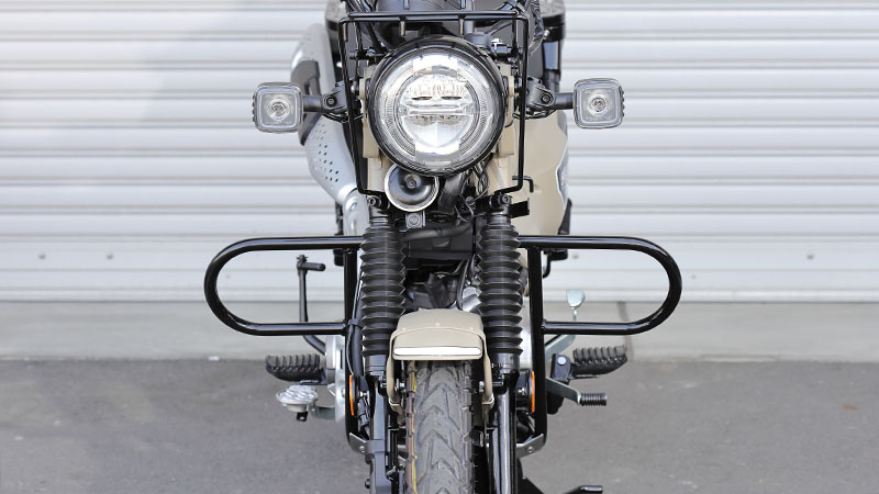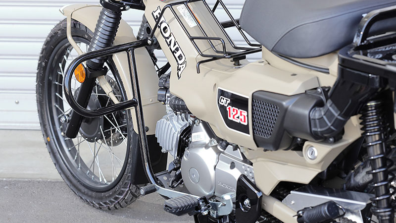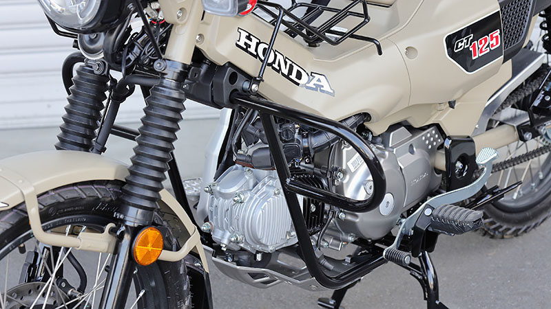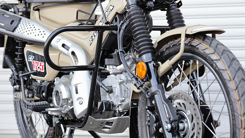 軽度な転倒や立ちごけからライダーを守るエンジンガード。アドベンチャースタイルを一気に高めるデザインと実際のアクシデントに対する実用性の両方から考えた形状。転倒時の状況を何度も繰り返し確認し、ライダーを守る視点からこの形状に辿りつきました合】CT125 ハンターカブ(2BJ-JA55) 2020Y-【サイズ】パイプ径:φ19 装着時最大幅:660mm【材質】スチール【色】ブラック