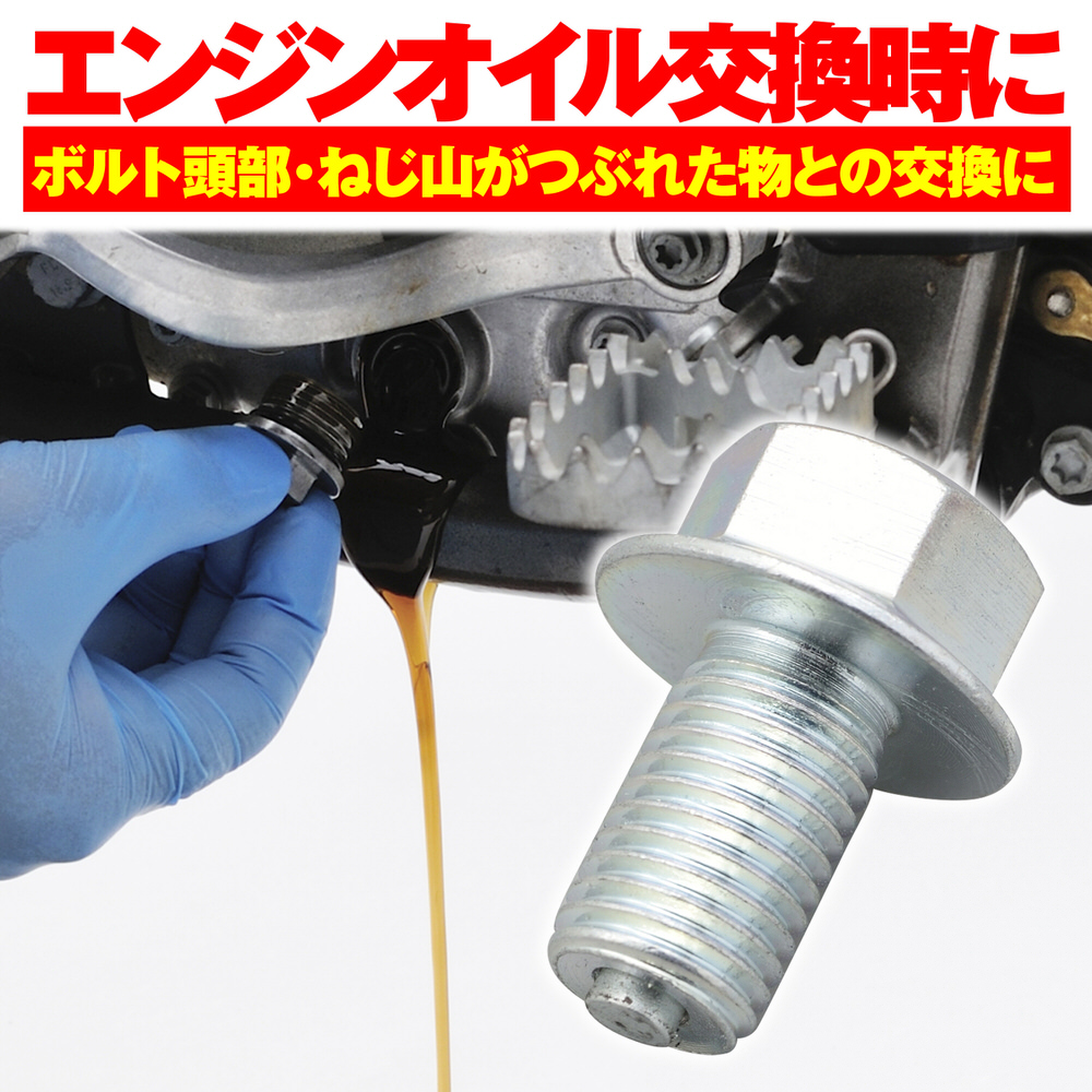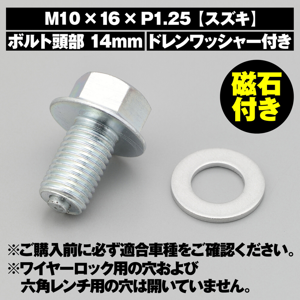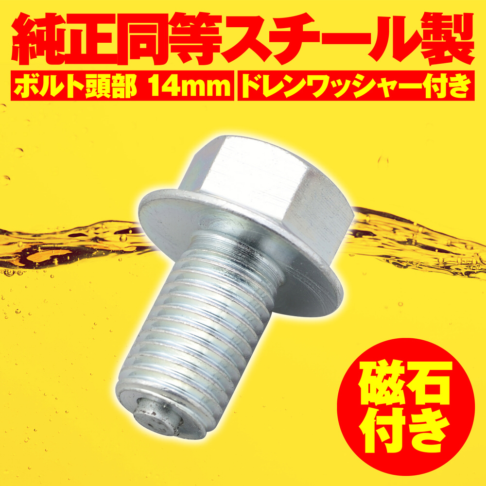 純正同等のスチール製ドレンボルトとアルミ製ドレンワッシャーが付属しています。シリーズを通してボルト頭の二面幅を14mmに統一。フランジ付きで汎用のドレンワッシャーが使用可能になります。ネジ先端部のマグネットにオイル中の鉄粉を付着させ、オイルをクリーンにキープします。【適合】スズキ系 / M10×16×P1.25 / ボルト頭部 14mm適合:スズキ系M10×16×P1.25 / ボルト頭部 14mmマグネットがオイル内の鉄粉をキャッチスチール製ボルトアルミ製ドレンワッシャー付属※締め付けトルクは各車両純正のサービスマニュアルをご覧ください。※ワッシャーはオイル交換の都度、新品に交換してください。