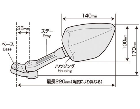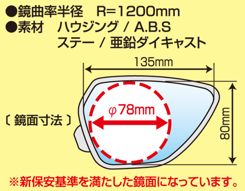カラー:ブラック鏡面:ブルー鏡材質:A.B.S+亜鉛ダイキャストネジ径:10mm 正ネジ・逆ネジボルト付き新保安基準部品構成ミラー本体(右側)×110mm正ボルト×110mm逆ネジボルト×110mmボルトキャップ×110mmボルトキャップ×1スペーサー×1六角レンチ×1クールなブルーのワンポイントでオートバイをスポーティに演出します。正ボルト、逆ボルトが同梱されているので、幅広い車種に装着可能。可動域の広い広角ジョイントを採用。歩行者や障害物に接触した際に「ショックスルージョイント」が衝撃を緩和する構造です。