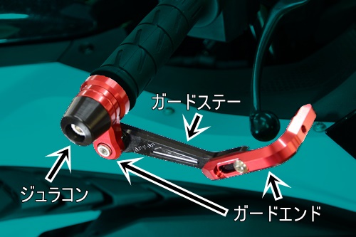 レーススタート時の接触によるブレーキ事故を防ぐ目的でレース等で使用されている商品です。レースのみではなく街乗りの際のハンドガードとしての機能性を考慮し、さらにバーエンドにはジュラコン(R)を装着する事により万が一の転倒時のダメージを軽減します。調整機能も備わっておりレバーに対してのクリアランスをお好みでお選びいただけます。備考※当商品は純正ハンドル専用となります。※パーツ名称説明詳細・ガードエンド・・・90度に曲がっているボルトで止められている部品とバーエンドの部分の2部品画像では赤色の部品(アルミ削り出し製)・ガードステー・・・バーエンドから前方へ伸びている部品のこと、画像では黒色の部品(アルミ削り出し製)・ジュラコン(R)・・・バーエンド部の先端にとりつけてある部品のこと、画像では黒色の部品(ジュラコン(R)製)※ジュラコン(R)は、ポリプラスチックス株式会社が日本その他の国で保有する登録商標です。