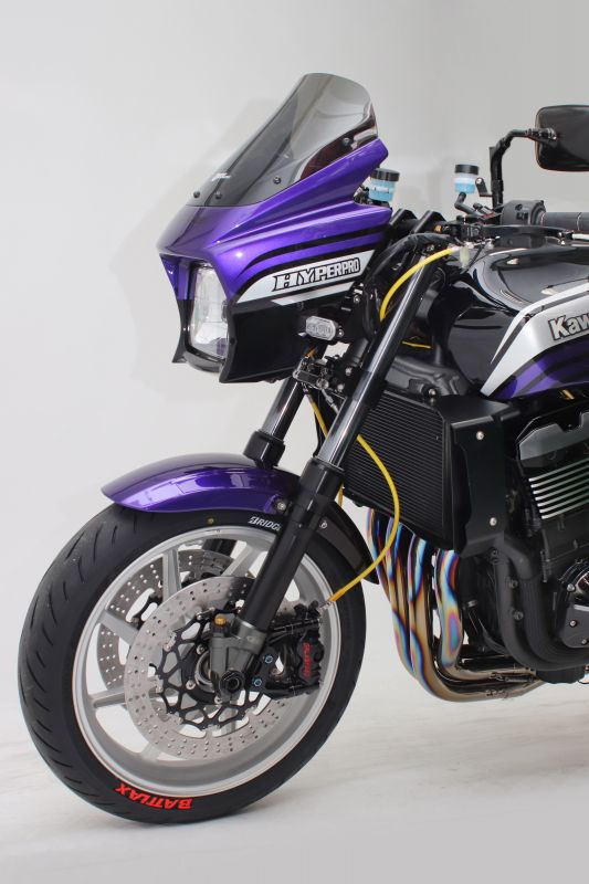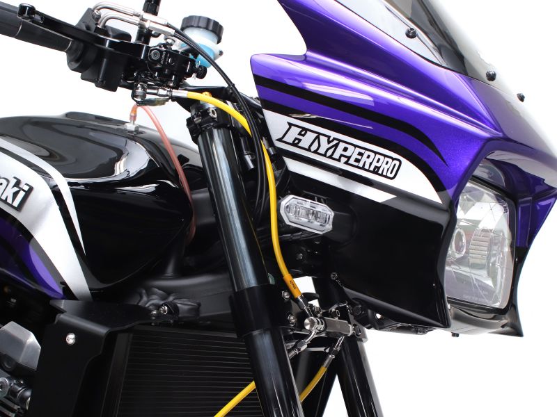 カウルをステムマウントからフレームマウントに変更することで、ハンドリングを軽快にします。上下・前後それぞれ2段階の位置調整が可能。装着したままでもフレーム番号が識別できる形状です。調整可動域:前後3°、上下最大10mm素材:A7075材T6ハンドルやマスターの形状によってはカウルに干渉する場合があります。純正カウル位置より約100mm前方に移動します。 HYPERPRO ステアリングダンパーステー同時装着不可