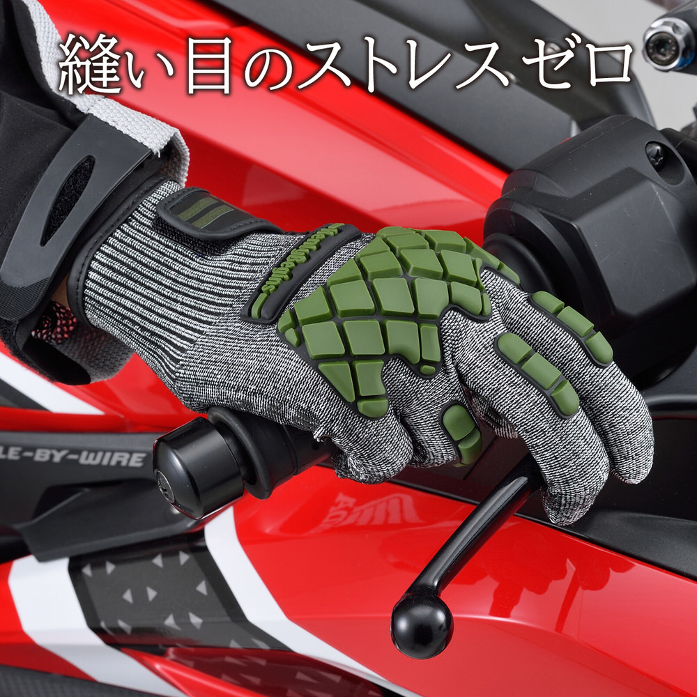 耐切創繊維を使っているので、薄手でも丈夫で安心。ストレッチ性に優れたシームレス製法で、ストレスなく使えます。
