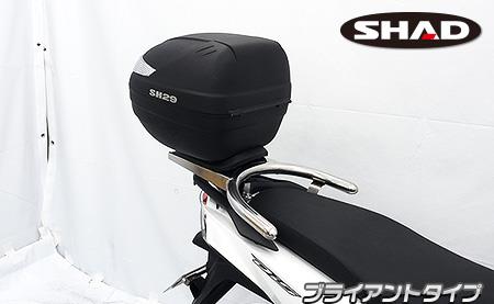 SHAD(シャッド) 製リアボックス【 SH29 】(サイズ:380mm (L) x 400mm (W) x 300mm (H)・本体重量:約2.6kg・容量:29L)を装備したタンデムバーです。リアボックスと、タンデムバーの同時装着を可能にしたニューアイテムです。リアボックスは車種よっては加工や専用ステーを別途購入しないと取り付けできませんが、タンデムバーにリアボックス用ベースブラケットを融合する事によって無加工で装着できるようにしました。タンデムバーはバランスの良い32mm径を採用。パッセンジャーが握りやすく力を入れやすいので、安全性も高くなっております。リアボックスのスペックはディフューザーダクトなどの付加物のある大きめのフルフェイスのヘルメットが1個と、グローブなど+αが収納できるサイズで最大積載量は3kgです。材質は無塗装ブラックの材質PP(ポリプロピレン)で、丈夫な作りになっています。開閉はレバーを押すだけで簡単にできます。付属のキーでロックも可能。リアボックスの取り外しはレバーを押すだけで簡単に脱着でき、持ち運びが簡単にできるのでいたずらや盗難から大切な荷物を守る事ができます。タンデムバーの材質は、耐久性、耐腐食性の高いSUS304ステンレス製です。リアボックス用ベースブラケットには、GIVI(ジビ) 製、COOCASE(クーケース) 製リアボックスのベースを取り付ける専用穴も開いていますので、それぞれのリアボックスもボルトオンで取り付け可能です。その他汎用リアボックスも取り付け穴を利用して取り付けできます。※穴あけ加工が必要な場合がございます。