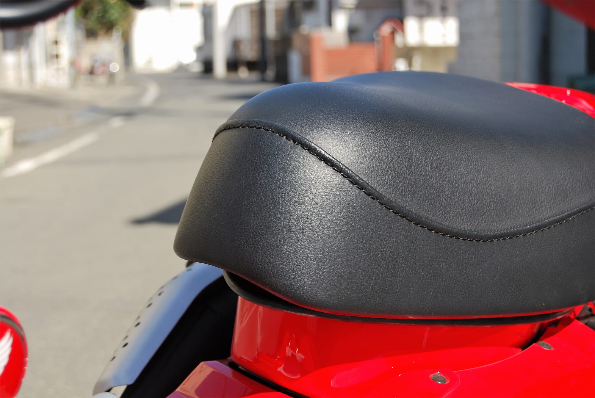 ※ご注文に際しては装着車両モデル・年式の確認が必要です。注文備考欄に入力をお願いします。純正シート比+20mm座面が高くなります。足を下す際の内腿に当たる部分の形状を工夫することにより、純正シートとほぼ同等の足つきを実現しています。着座位置が高くなるので膝の曲がりが緩やかになり、立ち姿勢に近くなることで、よりステップ荷重での車体操作がし易くなります。ステップ荷重が増え、相対的にお尻(シート)への荷重が減り負担が軽減されます。前方の内腿に当たる部分を独自の形状にすることにより、ニーグリップをしているのかのように車体を保持することが可能です。荷物を積載時や、極低速の振ら付きでも車体を安定させ易くなります。スポンジの厚みが増した事により格段に乗り心地が良くなっていますので、特に長距離ツーリングする方にお勧めのシートとなっております。そら豆ハイシート:820mm(純正シート:800mm)シートベースからオリジナルの専用設計です。純正シートから付け替えてご使用になれます。シートの取り付けは、純正シートと同様に鍵で行い、車体への加工は一切必要ありません。全体をプレーンブラックレザー、シート中央を一周する縫い目は、全てステッチ仕上げ。太目なステッチ糸を丁寧に縫い込んでいますので、シートひとつ換装するだけで、まるで車格が上がったように見えます。型の中で発砲させたインジェクションスポンジを使用していますから、クッション性良く経年変化が少ない為、長くご愛用いただけます。スポンジとシートベースは後から貼り合わせる製法ではなく型の中で一体成型していますので、レザーを張った際にも継ぎ目が無く大変きれいに仕上がります。