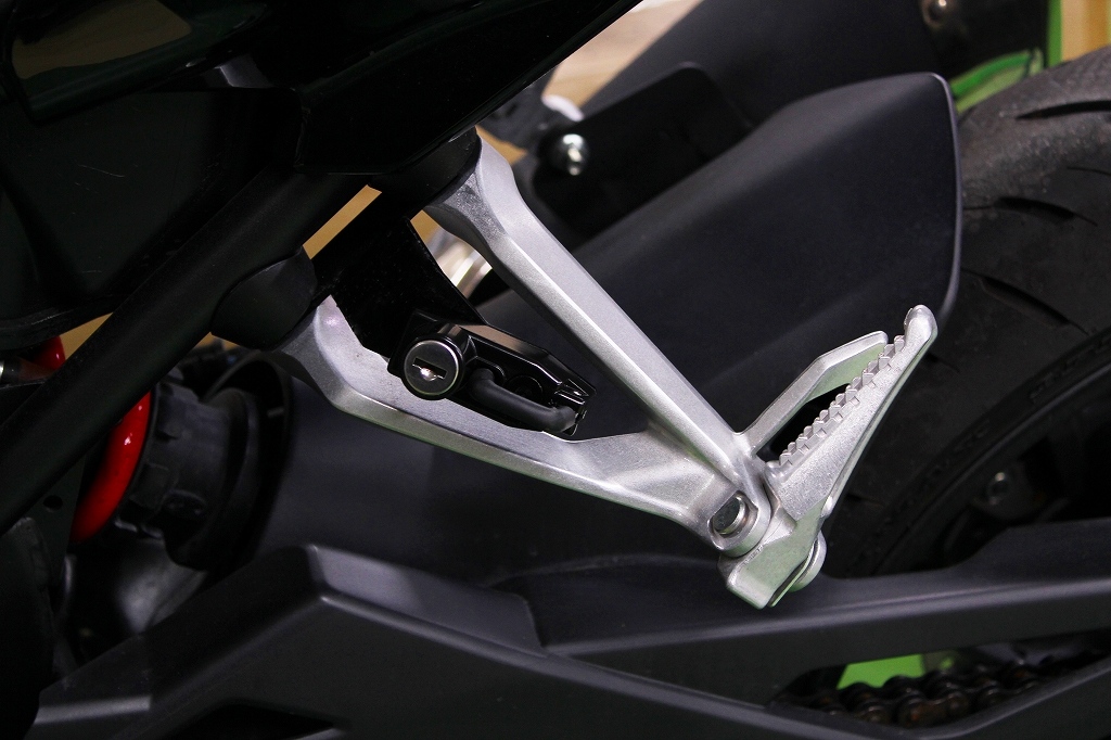 左側タンデムステップを取り外して、ステーを共締めするだけの簡単取り付け。ステーは耐食性が高いステンレス製となり、塗装が剥がれても錆びることはありません。ロックの開閉部は保護ゴムが付いている為、開閉部の傷や塗装剥がれを防ぎます。キーは2本付属しております。