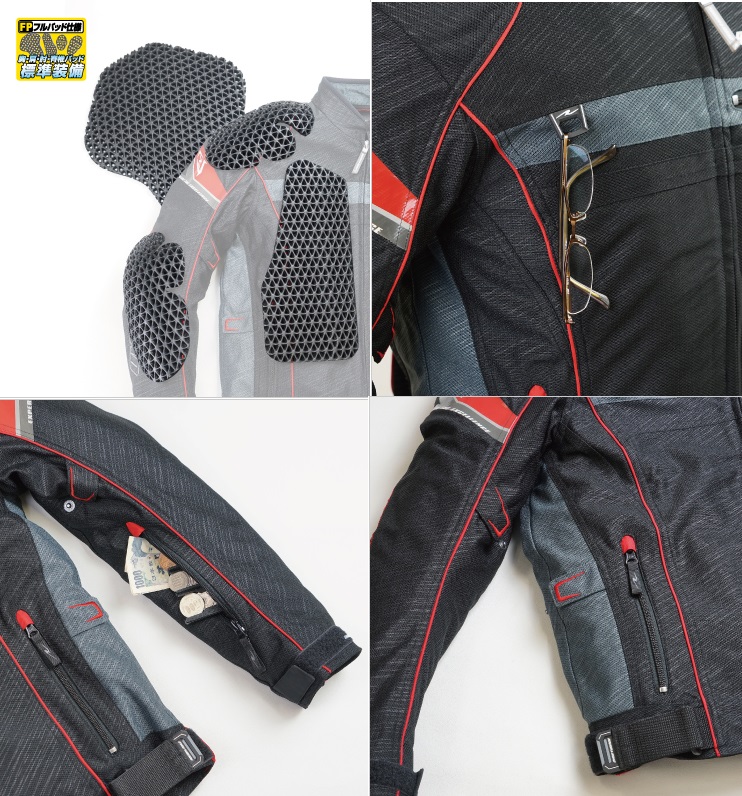 ライディングからシティーユースまで幅広くカバーするスピード感あふれるスポーティーなデザインは、跨るバイクのカテゴリーを選びません。高級感とともに優れた引き裂き強度を持つ立体構造のスパックスメッシュをメイン素材に使用することで、空気の流れを遮ることなく紫外線を効果的に遮断し、真夏の強烈な日差しから肌を守ります。胸・肩・肘・脊椎すべてをガードするフルプロテクションパッドはエアスルータイプ仕様で、抜群の通風性を確保しライディングへの集中力を妨げず、転倒にもしっかり備える安心感は他とは一線を引く別次元の仕上がりです。また、オールシーズン対応ファスナー装備で寒いときにはオプションの防風インナーを装着することも可能。女性から大きな方まで豊富に揃えたサイズ設定であらゆるニーズに応えます。MATERIAL: 表地/スパックスメッシュ 裏地/スーパーエアメッシュ 襟裏/アイスムースメッシュPROTECTOR: 胸・肩・肘・脊椎パッド標準装備