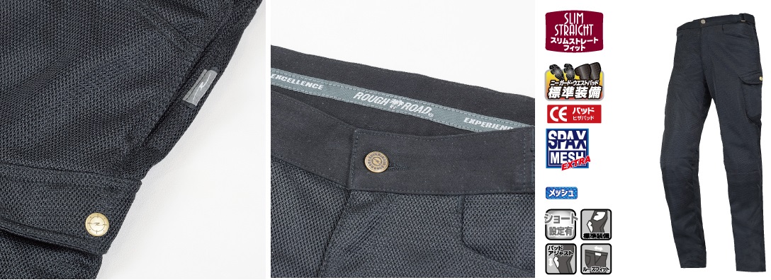 強烈な夏の太陽光を効果的に遮断する特殊製法を施した、高い引き裂き強度を持つスパックスメッシュEXTRAを採用。 ウエストパッド、ニーシンガードを標準装備し、しっかりライダーを守ります。気の利いたポケット配置と高い収納力により、ツーリング時の小物を上手に分類収納可能。ゆとりのルーズフィット仕様によりウエストのアジャストが可能で、スマートなシルエットはバイクに乗っても降りてもその場に自然に溶け込みます。シルエット: スリムストレートフィットSIZE(inch):MW(30-36)※サイズチャートMATERIAL: 表地/スパックスメッシュNEW 裏地/スーパーエアメッシュ