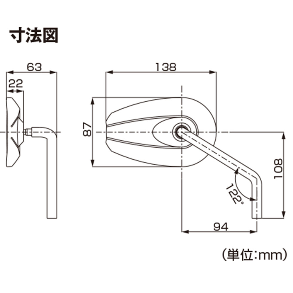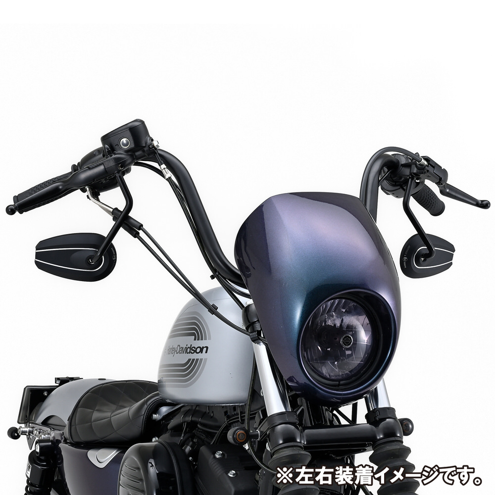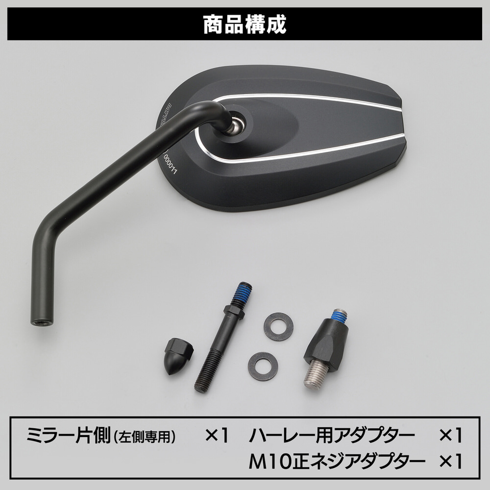 アルミハウジングにコントラストカットを施したハーレーダビッドソン用ミラー。ノーマルミラーのテイストにエッジを立てた楕円形のハウジングを採用。振動に強く後方視界に優れる、直径12mmの極太ロングロッド。ハーレーダビッドソンの他、付属の10mmアダプターで国産車にも装着可能。ハウジング:アルミ製ブラックアルマイト&コントラストカット鏡面:曲率R1250のクリアーミラー左専用の片側1個入りアルミ製ハウジング:シャープなデザインのコントラストカット / 曲率:R1250 クリアーミラーブレない極太ロッド:直径12mmのロッドで振動の多いバイクでもミラーがブレにくい110mmのロングロッド:鏡面が外側になることによって、腕や肩が視界を遮らないミラーアダプター:ハーレーダビッドソン用+10mmネジ用でハーレーと国産車に装着可能※HDアダプターを使用する場合は2007年以降新保安基準適合。※10mmアダプターを使用する場合、鏡面積は新保安基準に適合したサイズですが衝撃緩衝装置が無いため、新保安基準適合外となります。※ハンドル下側に装着する場合は、左右のミラーを反転させてください。