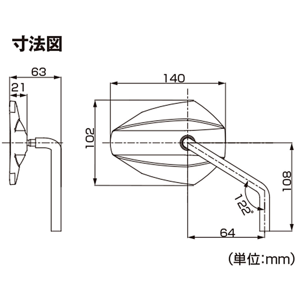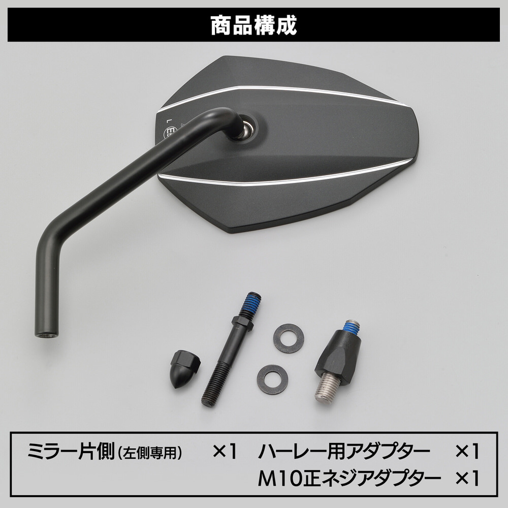 アルミハウジングにコントラストカットを施したハーレーダビッドソン用ミラー。8角形をべースに広い鏡面を確保し最も視界が広いハウジングを採用。振動に強く後方視界に優れる、直径12mmの極太ロングロッド。ハーレーダビッドソンの他、付属の10mmアダプターで国産車にも装着可能。ハウジング:アルミ製ブラックアルマイト&コントラストカット鏡面:曲率R1250のクリアーミラー左専用の片側1個入りアルミ製ハウジング:シャープなデザインのコントラストカット / 曲率:R1250 クリアーミラーブレない極太ロッド:直径12mmのロッドで振動の多いバイクでもミラーがブレにくい110mmのロングロッド:鏡面が外側になることによって、腕や肩が視界を遮らないミラーアダプター:ハーレーダビッドソン用+10mmネジ用でハーレーと国産車に装着可能※HDアダプターを使用する場合は2007年以降新保安基準適合。※10mmアダプターを使用する場合、鏡面積は新保安基準に適合したサイズですが衝撃緩衝装置が無いため、新保安基準適合外となります。※ハンドル下側に装着する場合は、左右のミラーを反転させてください。