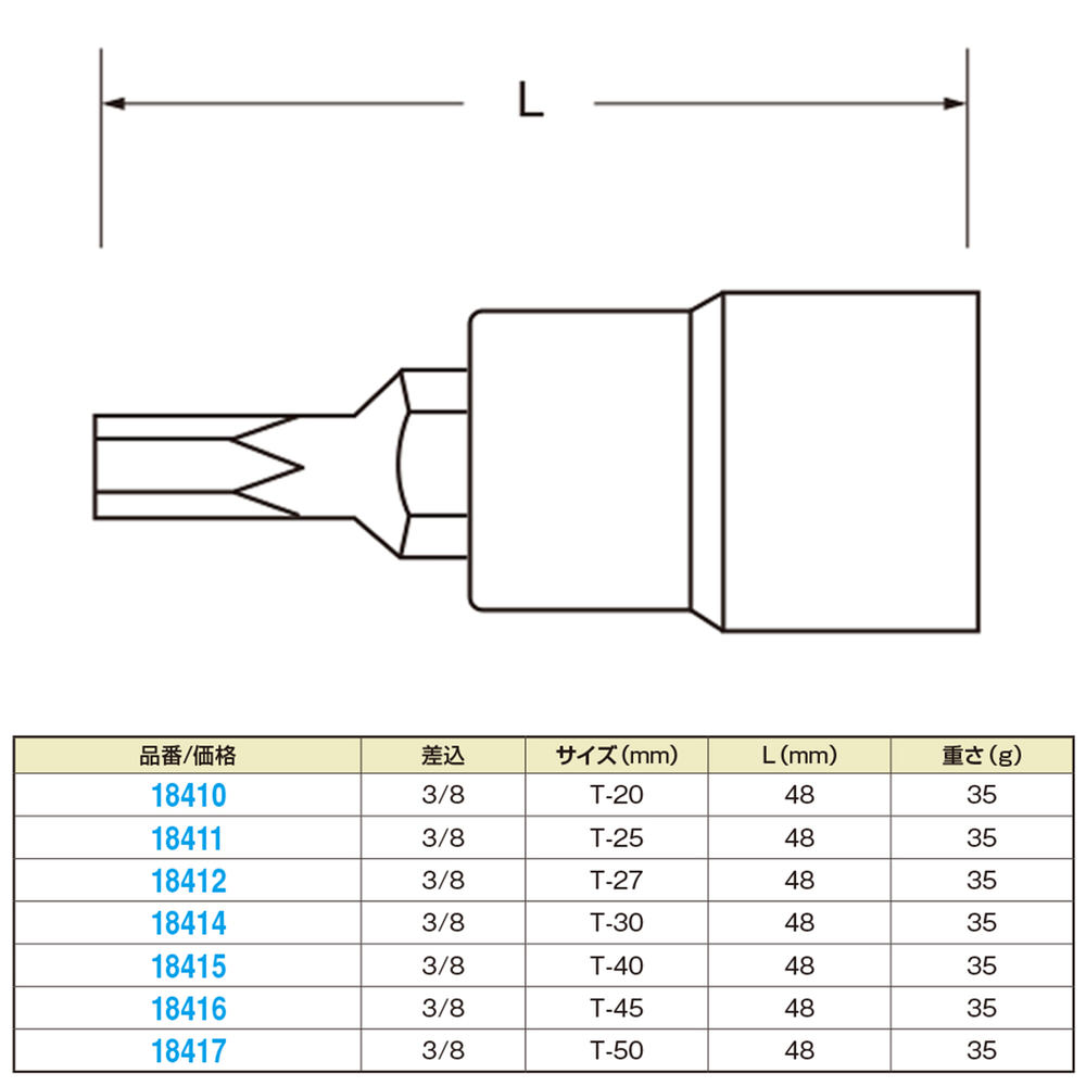 ヘクサロビュラ(トルクス)のソケット単品。差込角3/8インチ(9.5mm)に対応。サイズ:T-27差込角:3/8インチ(9.5mm)長さ:48mm