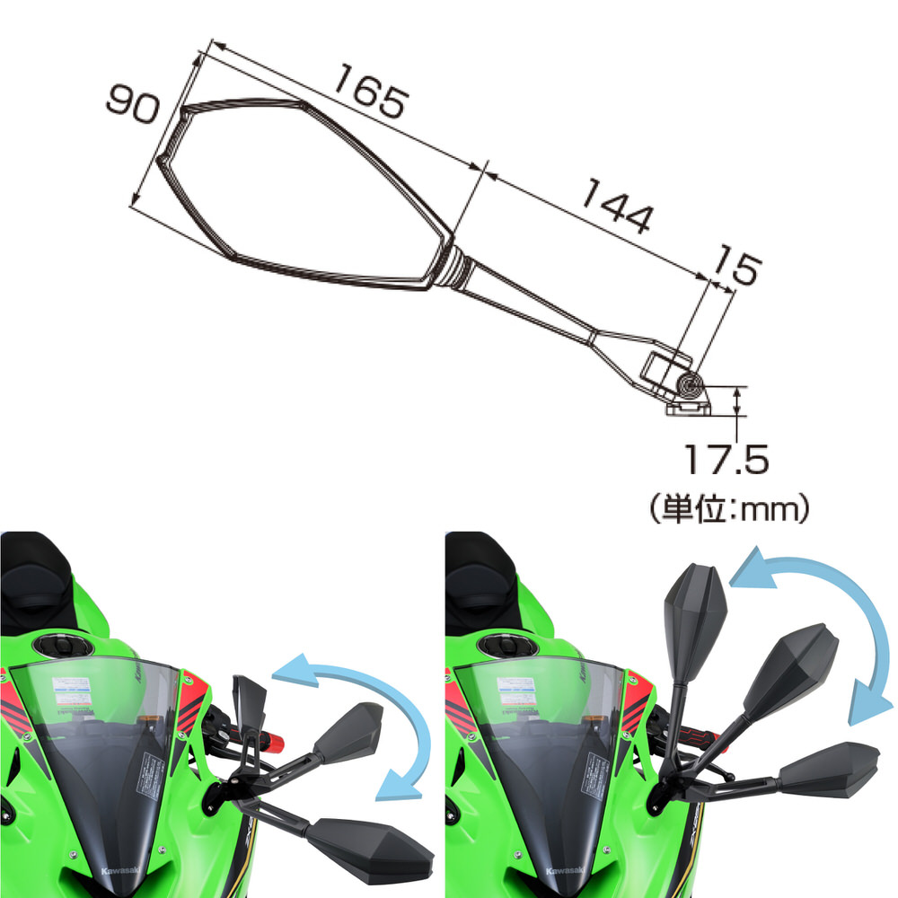 スポーツタイプに似合うに「角」を強調した個性的なデザイン。剛性が高く軽量なアルミダイキャスト製アーム&ジョイントとABSハウジングを採用した軽量でスタイリッシュなミラー。鏡の取付強度をUPさせることで鏡自体の共振を低減。小型のハウジングを採用しながら曲率R1000の広角ミラーで後方視界を確保。広い調整幅で様々な車種に対応。新保安基準に適合。【取付部分の形状図】・取付ボルトのピッチが26-54mmに合致すること。・純正ミラー取り付け部が平面であること。・純正ミラーがM6ボルト2本での取り付けであること。・ウインカー内蔵型ミラーは不可。・車種によって付属のボルトの長さが合わない場合があります。付属ボルト:M6×30、M6×20、M6×15(各2本)カウルミラー / 右専用1本入りミラー重量:約315g鏡の取付強度をUPさせることで鏡自体の共振を低減曲率R1000の広角ミラーで後方視界が広い新保安基準適合※ラバーベースを使用するとミラーの共振点(ブレ具合)が変化します。使用状況に合わせて使用してください。※車両によってはラバーベースを装着するスペースが無く、取り付けできません。その場合は直にミラーを取り付けしてください。【適合参考車輌】CB1300SB/ST(2005〜2021年)CBR600RR(2021年)CBR650R(2019〜2021年)CBR400R(2013〜2021年)CBR250RR(2017〜2020年)CBR250R(2011〜2015年)FZ1 FAZER(2008〜2014年)YZF-R3(2015〜2020年)YZF-R25(2014〜2020年)GSX-R1000(2017〜2020年)GSX-250R(2017〜2020年)ジクサーSF250(2020年)GSX-R125(2018〜2020年)Ninja1000(2017〜2019年)Ninja1000SX(2020〜2021年)Ninja650(2018〜2021年)Ninja400(2018〜2021年)Ninja250(2013〜2020年)Ninja250SL(2015年)Ninja ZX-25R(2021年)