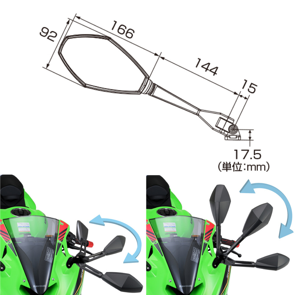 どんな車両にも合わせやすい六角形をベースにしたデザイン。剛性が高く軽量なアルミダイキャスト製アーム&ジョイントとABSハウジングを採用した軽量でスタイリッシュなミラー。鏡の取付強度をUPさせることで鏡自体の共振を低減。小型のハウジングを採用しながら曲率R1000の広角ミラーで後方視界を確保。広い調整幅で様々な車種に対応。新保安基準に適合。【取付部分の形状図】・取付ボルトのピッチが26-54mmに合致すること。・純正ミラー取り付け部が平面であること。・純正ミラーがM6ボルト2本での取り付けであること。・ウインカー内蔵型ミラーは不可。・車種によって付属のボルトの長さが合わない場合があります。付属ボルト:M6×30、M6×20、M6×15(各2本)カウルミラー / 左専用1本入りミラー重量:約315g鏡の取付強度をUPさせることで鏡自体の共振を低減曲率R1000の広角ミラーで後方視界が広い新保安基準適合※ラバーベースを使用するとミラーの共振点(ブレ具合)が変化します。使用状況に合わせて使用してください。※車両によってはラバーベースを装着するスペースが無く、取り付けできません。その場合は直にミラーを取り付けしてください。【適合参考車輌】CB1300SB/ST(2005〜2021年)CBR600RR(2021年)CBR650R(2019〜2021年)CBR400R(2013〜2021年)CBR250RR(2017〜2020年)CBR250R(2011〜2015年)FZ1 FAZER(2008〜2014年)YZF-R3(2015〜2020年)YZF-R25(2014〜2020年)GSX-R1000(2017〜2020年)GSX-250R(2017〜2020年)ジクサーSF250(2020年)GSX-R125(2018〜2020年)Ninja1000(2017〜2019年)Ninja1000SX(2020〜2021年)Ninja650(2018〜2021年)Ninja400(2018〜2021年)Ninja250(2013〜2020年)Ninja250SL(2015年)Ninja ZX-25R(2021年)