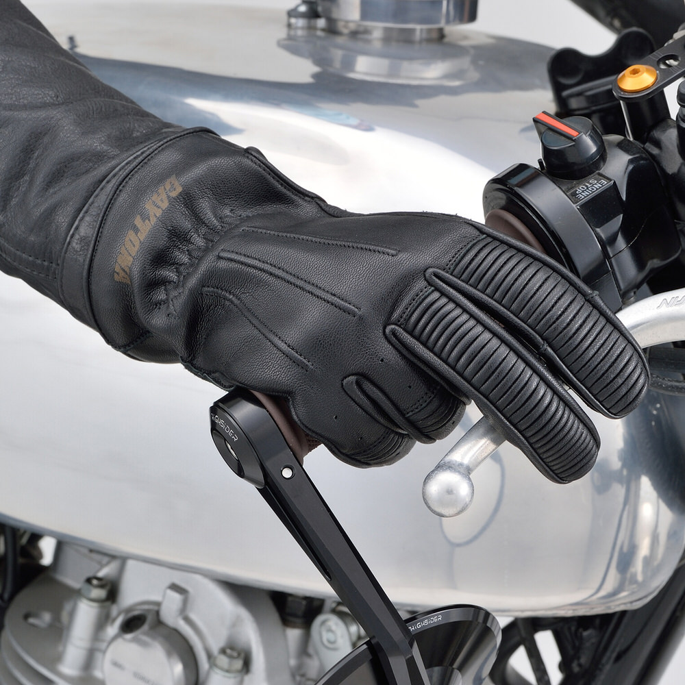 操作感に優れるヴィンテージ風グローブ。本革にワックス加工を施すことでヴィンテージ感を与えた、クラシカルなテイストのグローブです。指先のシャーリングと手の平の外縫い仕上げは、よりカフェレーサーらしさを演出するとともに握り心地を向上。手の平と指又の革を薄くすることで、高いフィット感を実現しています。カラー:ブラック素材:やぎ革シーズン:春夏秋タッチパネル対応※タッチパネルの感度はグローブとの密着度や個人差により感度にバラつきがあります。