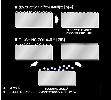 フラッシングの革命。フラッシングゾイルは、2輪車、4輪車のエンジン内部洗浄のために開発した、まったく新しいフラッシング専用オイルです。従来のフラッシングオイルは、有機溶剤系成分および洗浄成分により、スラッジ、汚れ等を、溶かしたり剥がしたりして落とす物でした。これでは有効な成分までも落としてしまう可能性があり、エンジンの調子を逆に悪くしてしまうことがあるのです。また相溶性がないため、落とした汚れがエンジン下部に残ってオイルフィルターを詰まらせることもあり、その結果、2度洗いをしなければならないものまであるのが現状です。フラッシングゾイルは、これらの問題を全て解決した、まさに「フラッシングの革命」ともいうべき商品です。高度に精製されたナフテン系およびパラフィン系ベースオイルを巧みに組み合わせ、さらにスーパーゾイル成分などを配合したこのフラッシングゾイルは、エンジン内の有効な成分を損なうことなく、余分なスラッジだけを包み込んで排出します。また、エンジン内に残っても安心な成分のみで構成されており、もちろん2度洗いする必要もありません。従来のフラッシングオイルと、「フラッシングゾイル」の違い(画像の2枚目)[図A]従来のフラッシングオイルの場合、スラッジだけでなく有効な成分も一緒に落とすことがありました。また、金属表面自体の変化はありません。[図B]フラッシングゾイルが余分なスラッジだけを包み込んで排出します。さらに、スーパーゾイル成分の働きで、金属表面を改質し滑らかな状態につくりかえます。使用方法使用中のエンジンオイルを全て抜き取り、オイルジョッキやじょうごを使用して本品のみを規定オイル量(エレメント交換時)の3分の2以上入れ、5〜15分程度負荷をかけないで走行するか、アイドリングを行ってから抜き取ってください。 フラッシングを行った際は、必ずオイルエレメントを交換してください。