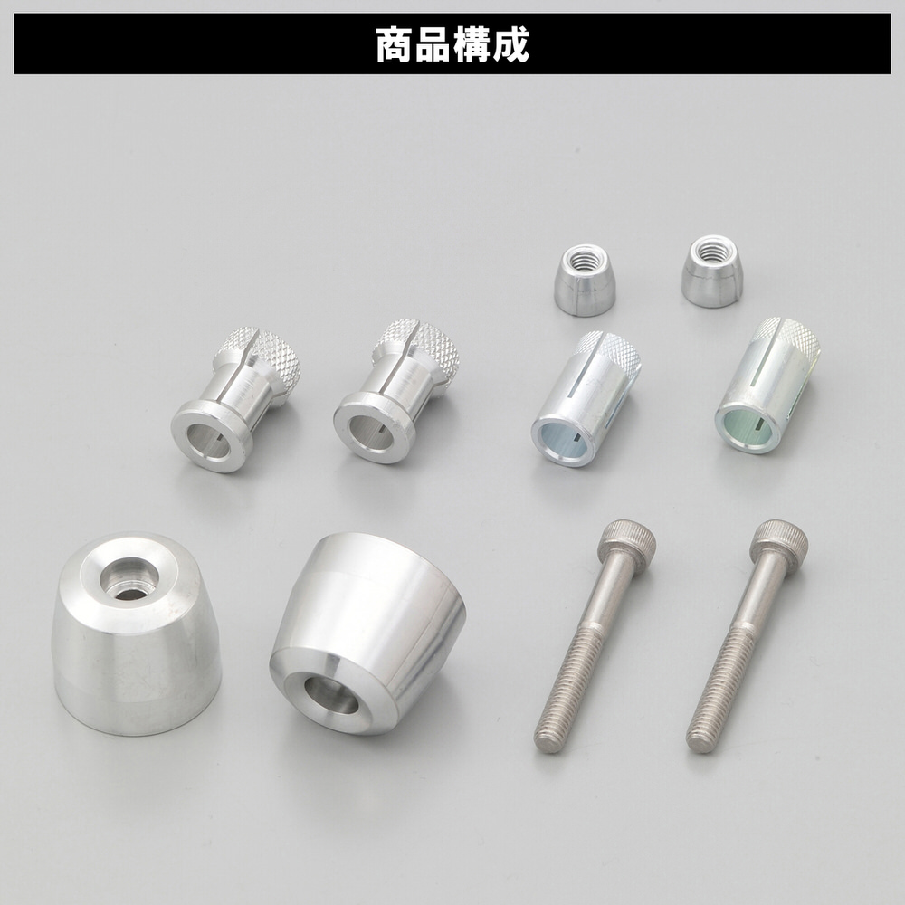 飽きのこないシンプルなデザイン。2種類のアルミ製取付アタッチメントが付属しハンドル内径φ14〜φ19まで幅広く対応します。転倒の際にはブレーキまたはクラッチレバーの破損を低減。また取付ボルトが破損しにくいデザインです。ハンドル内径:Φ14-19mm対応アルミ削り出し/アルマイト仕上げ外径:Φ30/全長:26.5mm/片側重量:約60gデイトナロゴ入り※ホンダ、ヤマハの一部の純正ハンドルに装着する場合は、インナーウエイトの取り外しが必要です。※一部のスズキ車純正ハンドルに対応しています。※スロットル側への装着の際は、グリップと接触しないように位置調整を行なってください。※アルマイト仕上げの商品は環境や使用状況により早期退色が発生する可能性があります。