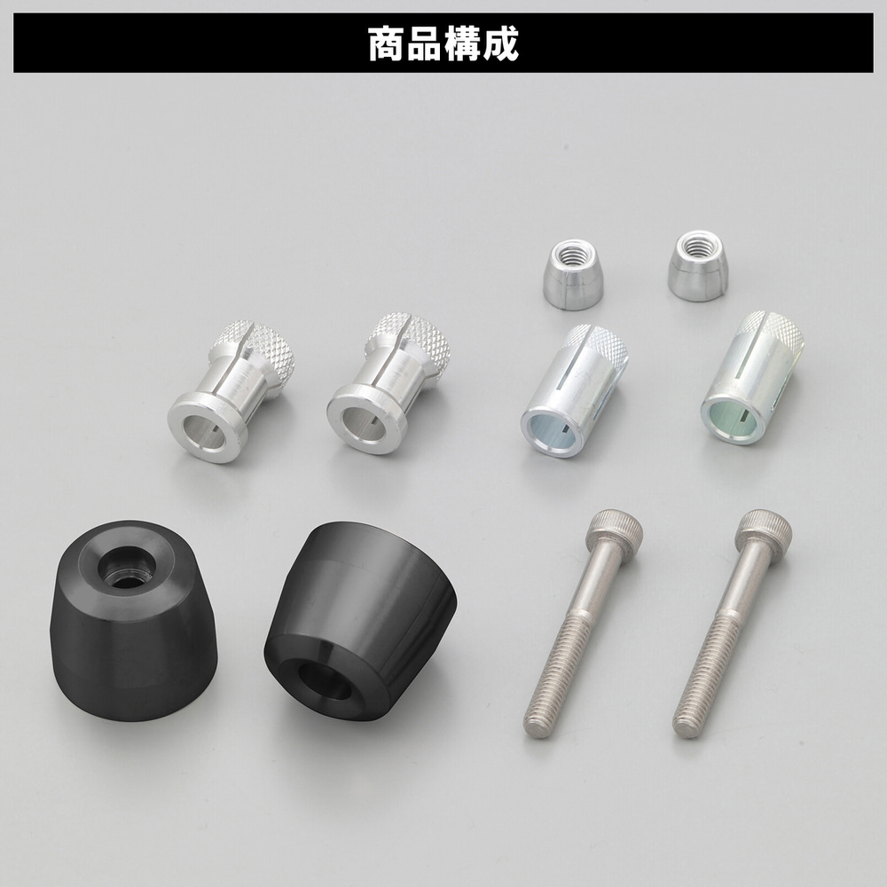 飽きのこないシンプルなデザイン。2種類のアルミ製取付アタッチメントが付属しハンドル内径φ14〜φ19まで幅広く対応します。転倒の際にはブレーキまたはクラッチレバーの破損を低減。また取付ボルトが破損しにくいデザインです。ハンドル内径:Φ14-19mm対応アルミ削り出し/アルマイト仕上げ外径:Φ30/全長:26.5mm/片側重量:約60gデイトナロゴ入り※ホンダ、ヤマハの一部の純正ハンドルに装着する場合は、インナーウエイトの取り外しが必要です。※一部のスズキ車純正ハンドルに対応しています。※スロットル側への装着の際は、グリップと接触しないように位置調整を行なってください。※アルマイト仕上げの商品は環境や使用状況により早期退色が発生する可能性があります。