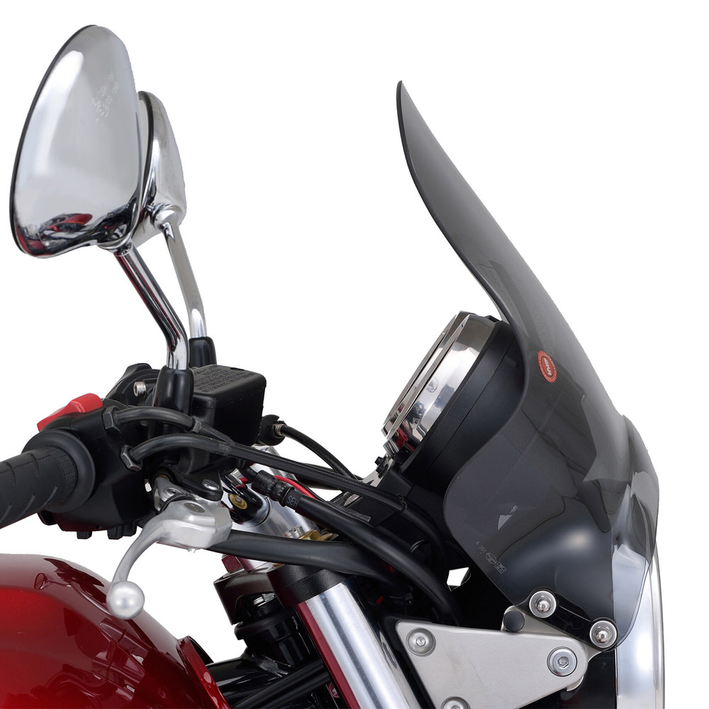 アメリカンからネイキッドまで、車種を問わず幅広く取り付けることができる汎用スクリーン。スクリーン取付角度は微調整可能。汎用フィッティング付属。汎用の小型スクリーン 高さ295×幅323(mm)形状:ハーフラウンド形状取付:ヘッドライトステークランプタイプ材質:アクリル製スクリーン色:セミスモーク※セミユニバーサル商品です。ヘッドライト回りの形状により一部取り付けできない車両もあります。※W650、400はライトステーが凹型なので市販のスペーサーが必要です。