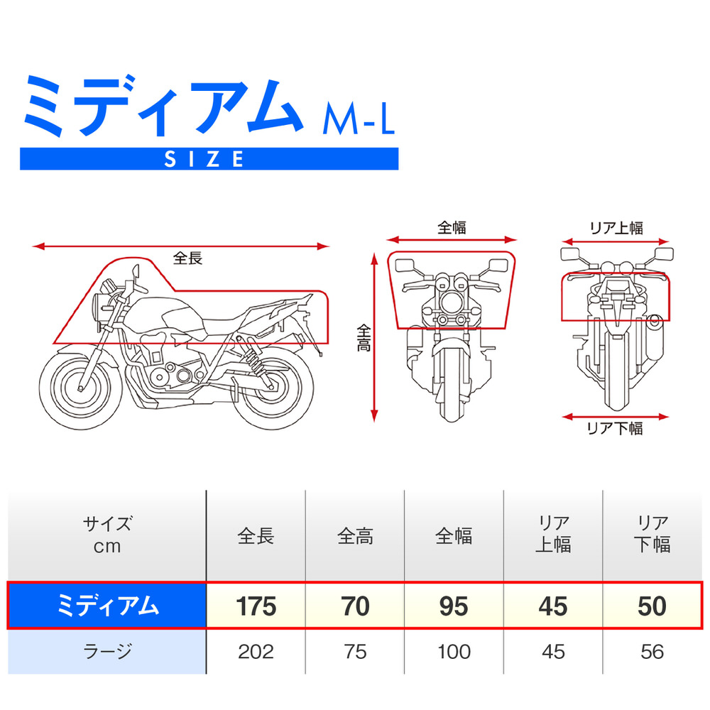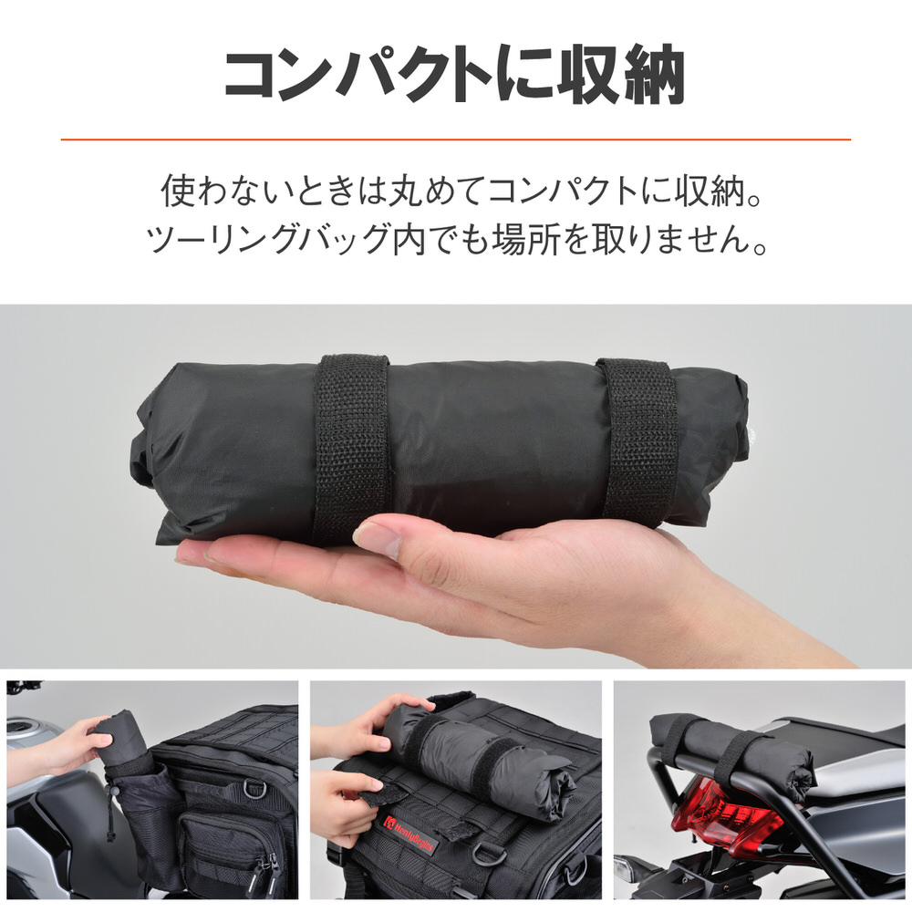キャンプ場での夜露対策やツーリング先のイタズラ抑止におすすめ。はっ水生地のバイク用ハーフカバーが夜露によるシートやタンクの水濡れを防ぐ。車体の上半分が隠れるので、駐車時のイタズラ防止効果もあります。後ろ裾のドローコードと左右のゴムベルトで簡単に固定でき、マフラーの熱に影響されにくいので、駐車時に直ぐ掛けることができます。使わない時はクルッと丸めてコンパクトに収納できるので携帯に便利。ツーリングバッグの中でも場所を取りません。対応車種:ハンターカブ等の125ccクラスからRebel250・400ccネイキッドクラスまでキャンプ場での夜露対策やツーリング先のイタズラ抑止はっ水コート処理 / シームテープ処理 / 耐水圧:800mmフロント裾はゴムで引っ掛けやすく、リア裾はドローコードで調節しやすいコンパクト収納で携帯に便利※トップケースやサイドケース・スクリーン等を使用している場合、フィッティングが異なります。※アップマフラーやセンターマフラー等、車体上部に発熱する部分がある車両はご注意ください。※生地には、はっ水処理を行なっていますが、完全防水ではありません。※定期的にはっ水スプレー等でメンテナンスを行なってください。※ ナンバープレートやウインカーの突出部分に、過度な力でドローコードを締めたりすると車両の破損に繋がります。