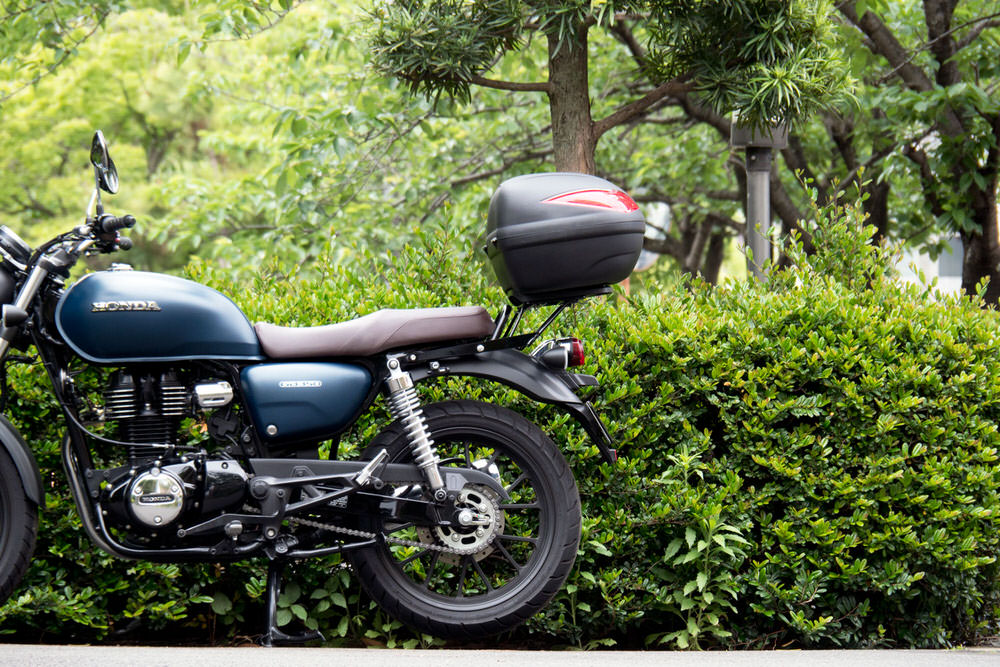 クラシックな雰囲気が特徴のホンダGB350。車両デザインにマッチする、スクエア型の天板が特徴のリアキャリア。真上から加わる力の耐久性を高めるため、補強部分の設計に拘ったリアキャリアです。剛性をしっかり確保した強度のあるスチール製材質は強靭なスチール製。最大積載量は5Kgと、大型のリアボックスも難なく積載可能です。 もともと積載しやすい形状をしているGB350ですが、更なる積載アップでキャンプツーリング等にも活躍しそうです。車体の形状に合わせたスクエア型の天板GB350のテール部分の形状に合わせスクエア型の天板に。シートと高さを揃えているので長物の積載にも役立ちます。また、リアキャリアを取り付けてもタンデムグリップを握る事ができる形状になっております。※積載物の形状によりますこだわりのフレーム構造天板を支える4本のフレームは横からみると台形型に補強を入れた構造になっております。あえて平行でない構造にする事により、強度を確保し天板からの負荷に強い造りにしています。◆お得なリアボックスセットキャリアがあったら、まず取り付けしたいのはリアボックス。本来であれば別売りのインナーも付属した、大変お得なセット販売です。■ボックスサイズ43L■セット内容・リアキャリア・リアボックス(サイズを4種類よりお選びください。)・ボックスインナー