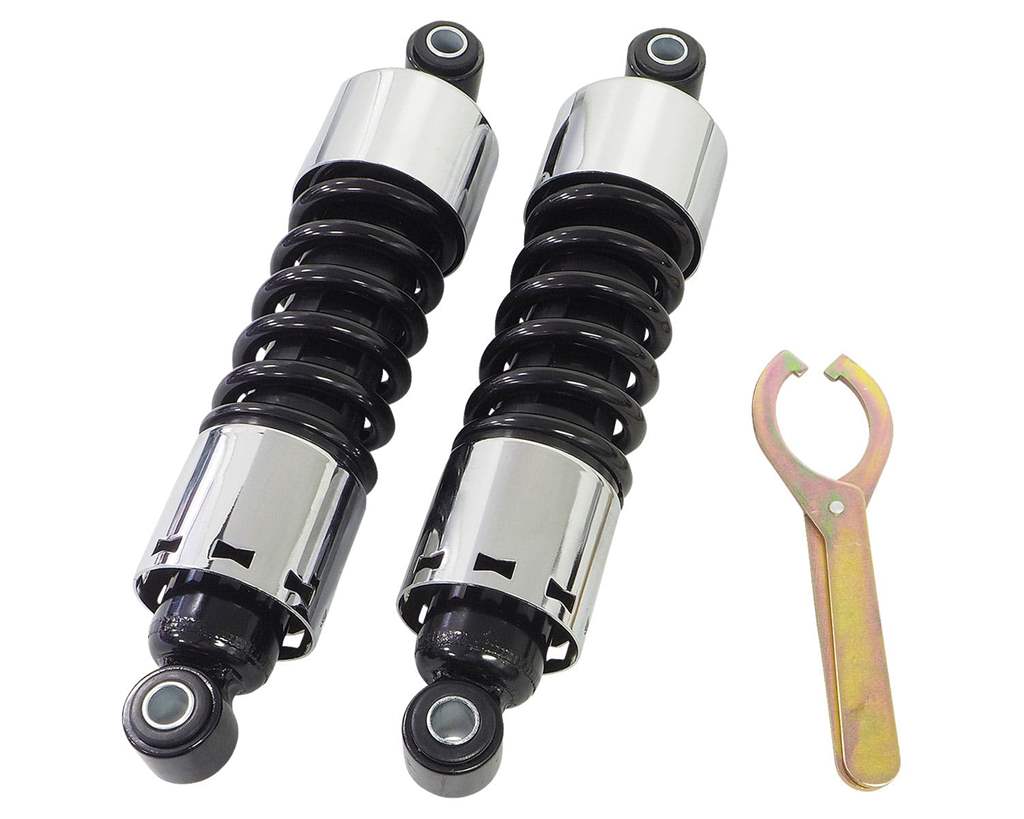 色:カバー:クローム スプリング:ブラックサイズ:取り付け部芯間:11.5インチ(約292mm)全長約322mm適合車種:1991年式以降のダイナモデル(2000年式以降のFXDX/Tを除く)2000年式以降のFXDX/Tに使用する場合は別途ショックスタッドキットが必要ですクロームスタッドとユニクロスタッドがあります)。素材:スチール内容物:リアショック×2ツール×1注意事項:必ずRフェンダーとベルトガードのクリアランス確認及びショックアブソーバーの上下アライメント確認を行ってください。必要に応じてフェンダー、ベルトガードをカットして使用して下さい。車高が変わるため、サイドスタンドの変更が必要になる可能性があります。商品説明:プリロード調整用のアジャストツールも付属していますので乗り方に合わせて調整して下さい。プリロードは5段階調整です。プリロードを調整する際には浸透性潤滑剤を使用してから回すと、スムーズに回ります。※右回しでプリロードが掛かり、左回しで緩みます。ちなみに2000年式以降のFXDXやFXDXTでも、ショックマウントスタッドを変更すれば適合可能になります