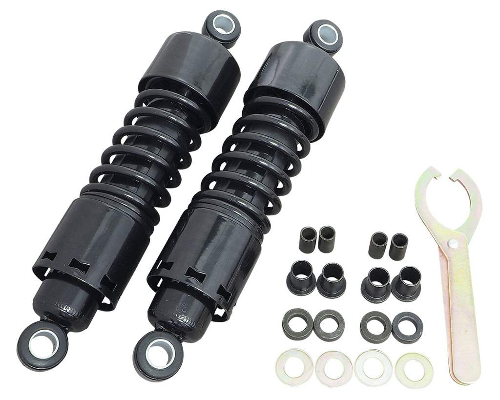 色:ブラックサイズ:取り付け部芯間:11.5インチ(約292mm)全長約322mm適合車種:1979〜2003年式までのXLモデル1982〜1994年式までのFXRモデル素材:スチール内容物:リアショック×2ツール×1注意事項:必ずRフェンダーとベルトガードのクリアランス確認及びショックアブソーバーの上下アライメント確認を行ってください。必要に応じてフェンダー、ベルトガードをカットして使用して下さい。車高が変わるため、サイドスタンドの変更が必要になる可能性があります。商品説明:プリロード調整用のアジャストツールも付属していますので乗り方に合わせて調整して下さい。プリロードは5段階調整です。プリロードを調整する際には浸透性潤滑剤を使用してから回すと、スムーズに回ります。※右回しでプリロードが掛かり、左回しで緩みます。ちなみに2000年式以降のFXDXやFXDXTでも、ショックマウントスタッドを変更すれば適合可能になります