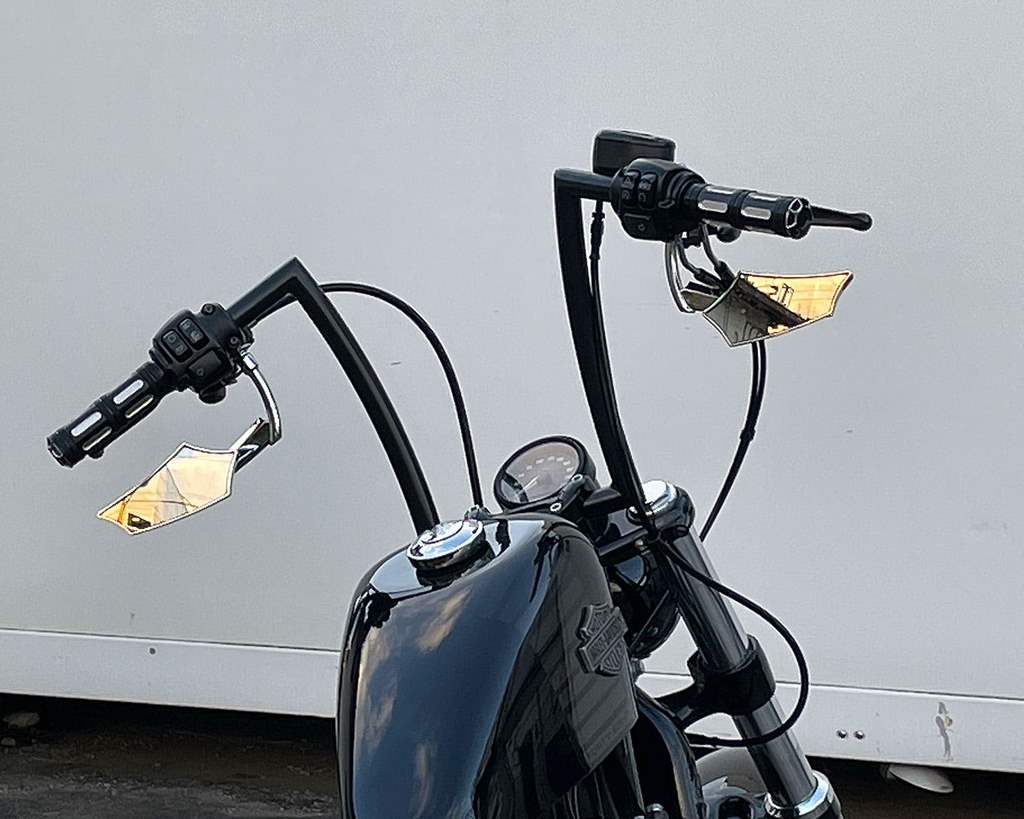 色:ブラックサイズ:全幅:約750mm 取り付け幅:約170mm高さ:約330mm プルバック:約130mmエンドライズ:約240mm適合車種:1インチバー採用のほとんどのハーレー素材:スチール内容物:ハンドル本体×1本注意事項:配線を逃がすヘコミが無いタイプです。電子スロットルには対応しません。※クランプ幅(取り付け幅)をご確認下さい。商品説明:ロボットハンドルバー、略してロボハンとも呼ばれますね。若干カーブ(湾曲)したカスタム仕様のZバーです。基本的に純正ハウジングを使用する場合、〜82年式まではヘコミ無し、それ以降はヘコミ有りが対応となりますが、もちろんカスタムの次第で変わる場合もありますのでご注意下さい。