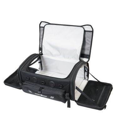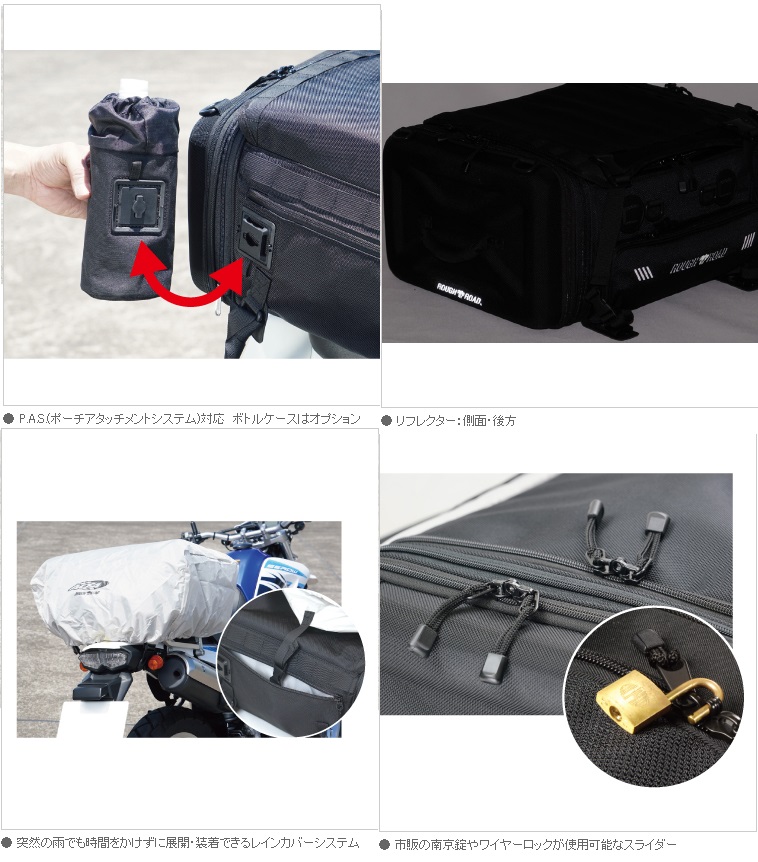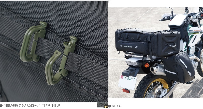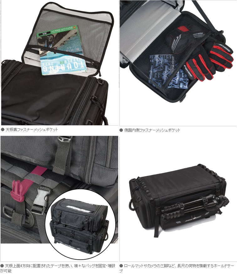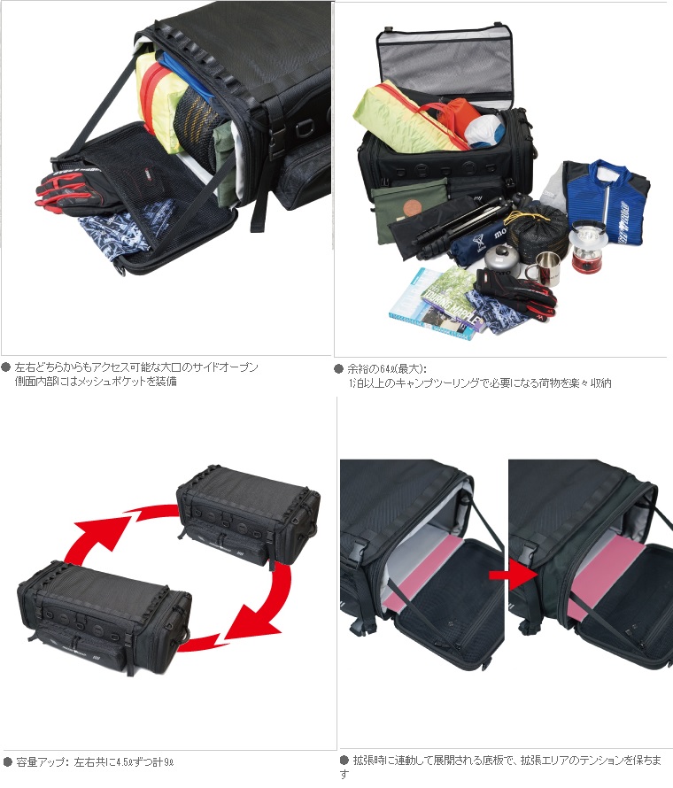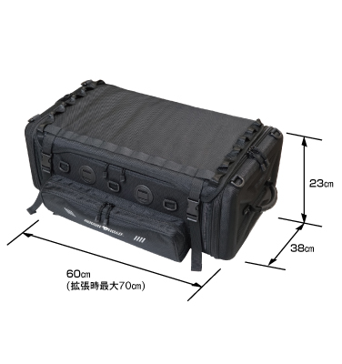 両サイドに成形パネルを採用したスクエアスタイルで、低重心の積載安定性に優れたシートバッグ。スクエアでフラットな上面に樹脂プレートを入れ補強し、バッグ上部への積み重ねを考慮した設計。上部フラットトップにはウエービングテープを四辺に設置し、カラビナ、アジャスタブルバンジーコードのJ型フックはもちろん、RR9976グリムロックにも対応し重ね積みをサポートします。容量はノーマル時で55リットル、左右を拡張すると最大時で64リットルまで増量可能。サイドを容量アップする拡張部分の底面はオートマチックに樹脂製プレートが延伸し、左右の垂れによる荷崩れを防止する安心構造。横幅は標準で60cm、最大で70cmまで拡張するので大型テントなどもスッポリ収納可能。また長尺物は外にあるホールドベルトにも固定可能。両サイドの成型パネルで形を整え、その他の面には樹脂プレートを入れたインナーフレーム構造で荷崩れしにくく収納物をしっかり保護します。両サイドオープンファスナー仕様で、バッグ上部に荷物を積んでも上部入り口を使用せず両サイドから荷物の出し入れが可能なサイドオープンタイプを採用した親切設計。そのサイドパネル内側はマチ付きのメッシュインナーポケット付きです。背面にある専用ポケットにレインカバーは収納してありバッグ本体とバックルで連結でき、カバー飛散の心配が不要です。標準装備の積載ベルトを車体に設置すればバックルのみで脱着が可能です。これがあれば長期ツーリングも安心です!容量: 55〜64?(最大)SIZE: W60〜70×D38×H23cm