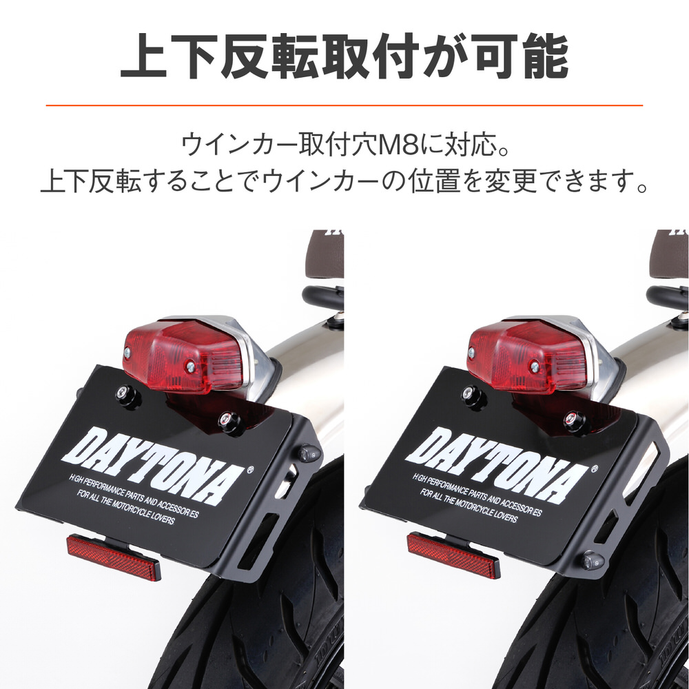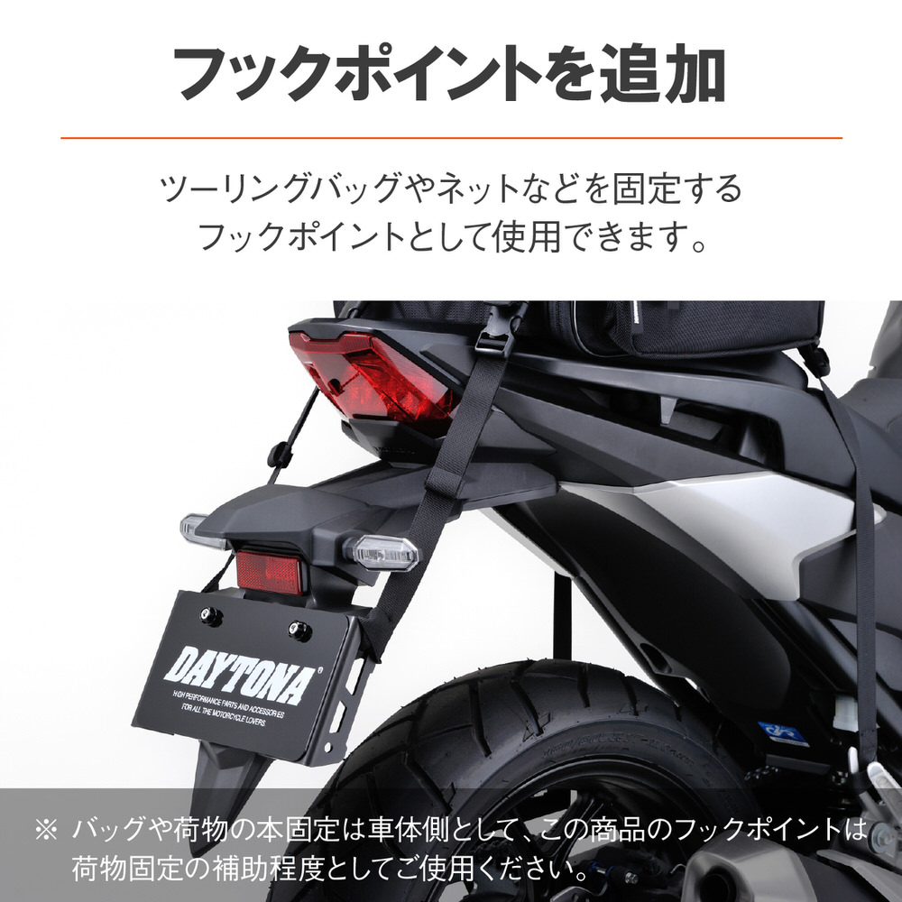 これ一つでウインカー取付、ナンバー保護、フックポイントの3役をこなす優れもの。強度に優れた3mm厚アルミ製リアウインカーブラケット。M8ウインカーの取り付け、ナンバーの保護、ネット等をかけるフックポイントとしても使用可能。プレートを上下反転させることによってウインカーの取付位置を上側と下側と選ぶことができます。小型ウインカー専用のウインカーステー取付可能ウインカー:M8(片側40g以下)ネットなどをかけるフックポイント付き強度に優れた3mm厚でナンバープレートの保護にも寸法:高さ125×幅250×奥行30(mm)(最大幅)※フックポイントとして使用する場合は車体側のフェンダー強度(純正フェンダーにフレームが入っていること)を確認してください。※バッグや荷物の本固定は車体側として、この商品のフックポイントは荷物固定の補助程度としてご使用ください。※リアフェンダーの変形や破損等に十分な注意が必要です。※片側40g以上のウインカーは取り付けできません。※デイトナ社ナンバープレートホルダーと同時装着はできません。(他社製品も同様です。)※デイトナ社フェンダーレスキットと同時装着はできません。(他社製品も同様です。)※HIGHSIDER ロケットクラシック、HIGHSIDER ロケットブレット、HIGHSIDERエンタープライズEP1は重量が重いため取り付けできません。