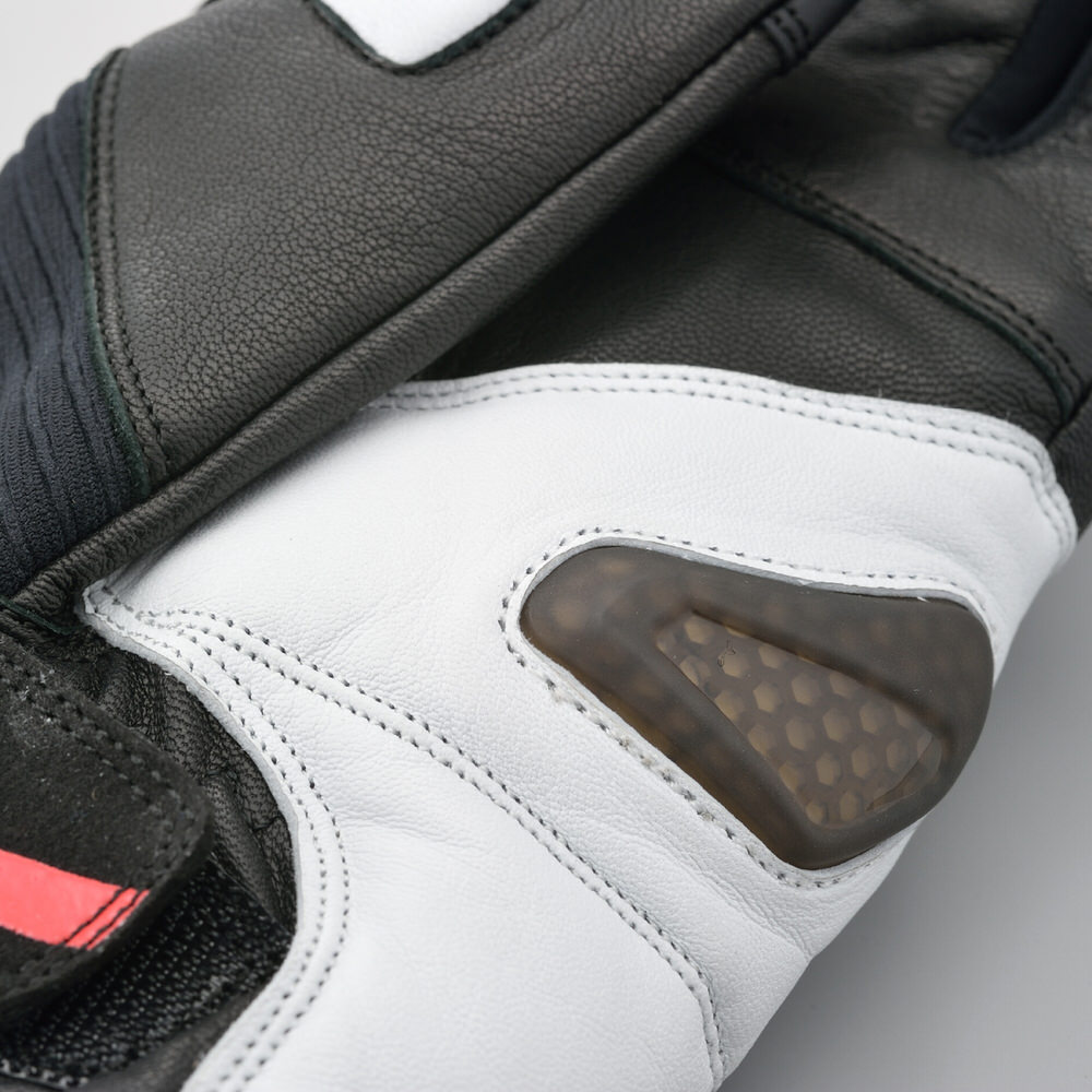 各所にプロテクターを装備し、多面に本革を使用することで安全性を確保したスポーティなグローブ。