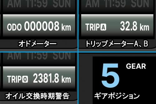 ■スピードメーター 0〜360km/h速度設定(設定範囲 300〜2500mm 設定単位 1mm)速度警告灯(設定範囲30〜360km/h 設定単位1km/h) 最高速度記録(表示範囲 0〜360km/h 設定単位 1km/h)■指針式タコメーター 0〜13000rpm回転数警告灯(設定範囲:1000〜13000rpm 設定単位:100rpm)■デジタルタコメーター 0〜20000rpm回転数警告灯(設定範囲:1000〜20000rpm 設定単位:100rpm)点火設定(設定範囲 0.5・1〜24 設定範囲 Hi Act・Lo Act)■西暦/月日/曜日設定を行うことでキーON時のオープニング画面に表示されます。曜日は西暦と月日を設定した際、自動で入力されます。■ オド/トリップメーター・メンテナンス走行距離・ギアポジション■オドメーター 0〜999999km(表示単位:1km 範囲を超えると0に戻ります)トータル走行距離ユーザーオド設定(始点距離任意入力)■トリップメーターA、B 0〜9999.9km(表示単位:0.1km 範囲を超えると0に戻ります)外部スイッチ操作により、トリップメーターBへ表示切替え■オイル交換時期警告入力した走行距離は、走行することで自動で減少します。メンテナンス距離(通知モード)(設定範囲:500〜16000km 設定単位:100km)■ギアポジション(表示内容:全ギア表示、全ギア非表示)学習モードによるギア数登録機能■ 時計・電圧計・温度計・燃料計■時計/曜日(設定範囲:12時間、又は24時間)曜日は西暦と月日を設定した際、自動で入力されます。■電圧計(表示範囲:8〜18V)電圧警告灯(設定範囲8〜18V 設定単位:0.1V)■温度計(表示範囲:0〜250℃)別途SP武川製ドレンボルトをご購入頂く事で、ドレンボルト部での温度計測が可能です。温度警告灯(設定範囲:60〜250℃)最高温度記録(設定範囲:0〜250℃)■燃料計(表示範囲:6段階)フューエルセンサー抵抗値プリセット100Ω 250Ω 270Ω 390Ω 510Ω 1200Ωユーザー抵抗値設定 抵抗値範囲:0〜1500Ω燃料警告灯■ 空燃比計・パワーテスト機能・インジケーターランプ・外部スイッチ■空燃比計(表示範囲:12.1〜17.5)別途SP武川製O2センサー、O2センサーボスが必要になります。O2センサーボスの取付け方法:エキゾーストパイプに穴開け加工を行い、O2センサーボスを溶接加工にて固定する必要があります。温度計と空燃比計の同時表示はできません。装着するセンサーにより、機能表示の切り替えが出来ます。■パワーテスト機能目標速度記録(Target Speed)目標距離記録(Target Distance)最高速度記録(Top Speed)各記録はレコード表示されます。最高レコードは一番上に表示され、No.2以下は計測順に表示します。記録はリセットが可能です。目標速度/距離設定は機能設定にて、指定数値を設定します。■インジケーターランプ警告灯・ターンランプ・ハイビームランプニュートラルランプ・エンジン警告灯オイルチェックランプ・ABSランプ■外部スイッチメーターの操作や機能設定は、すべてメーターに付属の外部スイッチを使用します。■ バックライト■バックライトDay/Nightモード液晶画面 AUTO切り替え機能輝度調整機能照明色の切り替え機能照明色:白、赤、橙、緑、青、黄Dayモードは指針式タコメーター目盛りのみ変更が可能Nightモードは指針式タコメーター目盛りとメイン液晶のグラデーション部分の変更が可能■ 注意事項H.I.D.や他社製LEDヘッドライト、フォグランプ類との同時装着は出来ません。バラスト/インバーター(電圧変換装置)からデジタル回路に悪影響を与える高電圧ノイズが出る物があり、製品故障や動作不良の原因になります。ギアポジションの設定に関して ギアポジションの設定にはスピード信号とエンジン回転信号の両方がスーパーマルチTFT メーターに入力される必要があります。その為、“実走行"による自動読み込み作業が必要になります。市街地では信号機や交通量が多く危険の為、ギアポジションの設定は行わないで下さい。走行の際は見通しの良い道路を選択し、周囲の道路状況を確認した上で、注意して行って下さい。
