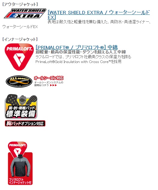 ウインターパーカーにプリマロフト インナージャケットをインサートした、厳冬期寒風をものともしない、防風・防水・透湿、超防寒仕様で、ツーリングシーンを暖かくサポートします。プリマロフトは米国のAlBany社により、米軍向けの中綿素材として開発された、超軽量最高の保温性能、撥水性、イージーメンテナンス性を兼ね備えた超微細マイクロファイバー素材で、過酷な環境でも使える画期的な人工中綿です。ロング・ショートツーリングはもちろん、名所、旧跡等も躊躇なく行けるさりげないデザイン。また、ベンチレーション装備のため、インナージャケットを外して3シーズンジャケットとして秋冬春と長期間活躍します。付属のインナージャケットはシンプルなデザインで単体着用も可能です。MATERIAL:表地/タッサー(ナイロン)、裏地/タフタウォーターシールド加工(ナイロン、TPUボンディング)、インナー/タフタ(ナイロン)、起毛トリコット(ポリエステル)、中綿/プリマロフト(ポリエステル)PROTECTOR:肩・肘・脊椎パッド 標準装備 (胸パッドはオプション)プリマロフト インナージャケット 標準装備