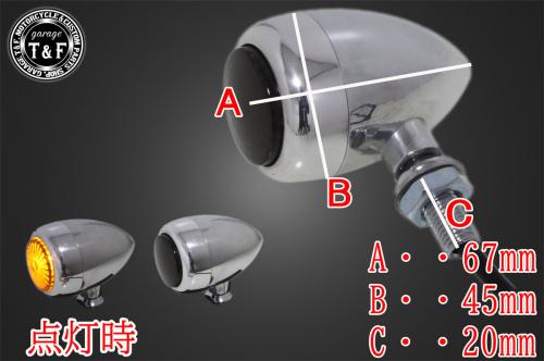 ・ボディー素材:アルミ製。ポリッシュ仕上げ・レンズ素材:プラスチック製・レンズ径:31Φ・バルブ:LED・レンズ色:ダークレンズ・サイズ:全長67mm。取り付けネジ径:M10-P1.25-20mm【製品の特徴】・LED仕様です。【注意事項】・こちらのウィンカーは汎用品となります。・取り付けされます車種によってはウィンカーリレーの交換及びダイオードを使用して抵抗値の変更が必要となります。・ダイオード、ウィンカーリレーを使用する場合はガレージT&Fの製品をお使い下さい。他社の製品を使用した場合の動作保証は出来ません。・LEDウィンカーの取り付けには専門的な知識が必要となります。個々のバイクへの取り付けサポートは出来かねます。基本的にはバイク屋さんまたはカスタムショップ様にご依頼することをお勧め致します。
